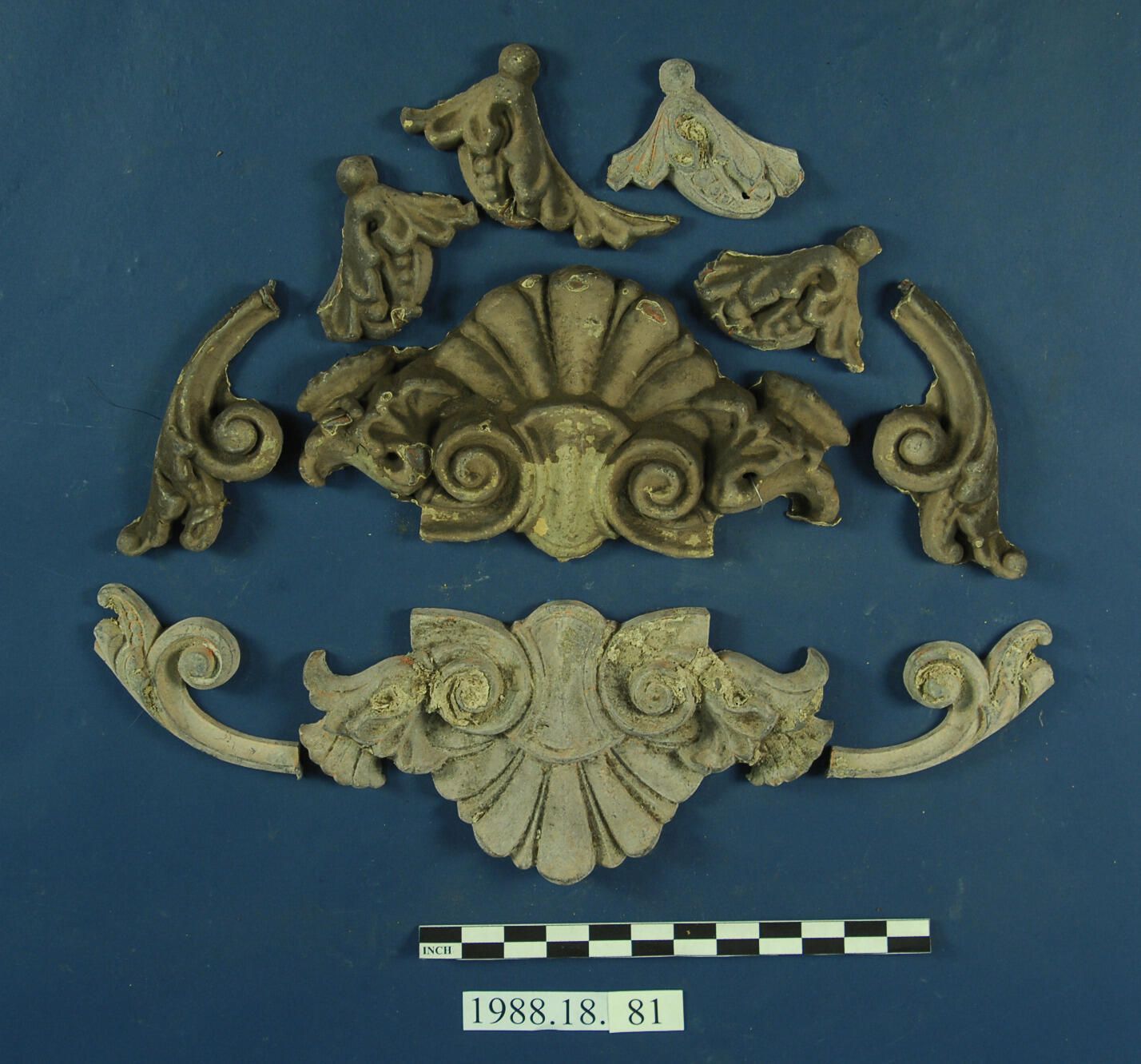 One lot of ten cast zinc Ornaments. Unidentified building component. Botanical / Scroll / Scalloped Motifs. Painted or remnants of paint.