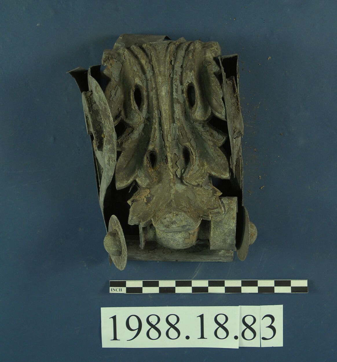 Composite bracket. Cast zinc. Acanthus Ornament on front. Turned half-reel below. Body of bracket of sheet metal including scrolled sides and curved backing strips. Originally soldered together. Now disassembled. Has remnants of paint. Exterior building component. Composed of six pieces.