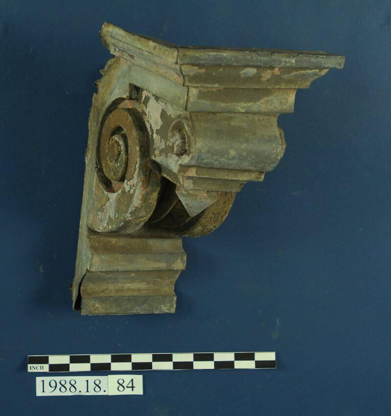 Composite bracket. Galvanized sheet iron / steel body. Compound molding profiles. Sections missing. Has cast zinc scrolled sides and fluted center has conical drop at center. Remnants of paint.