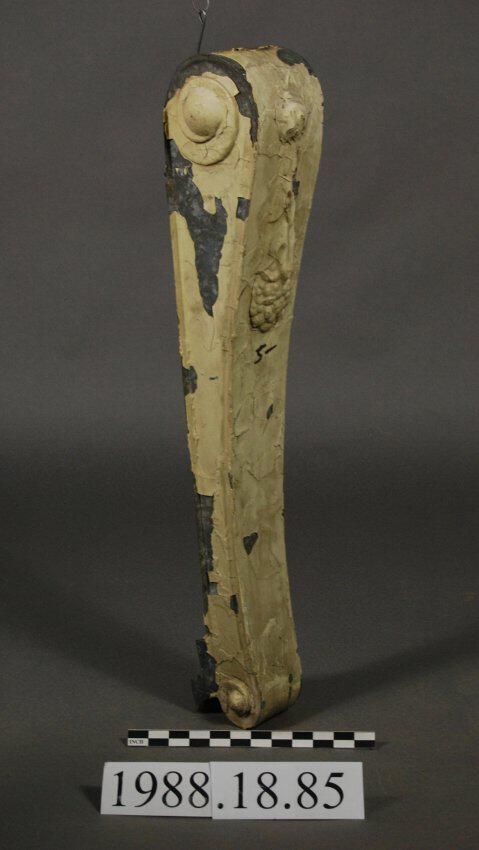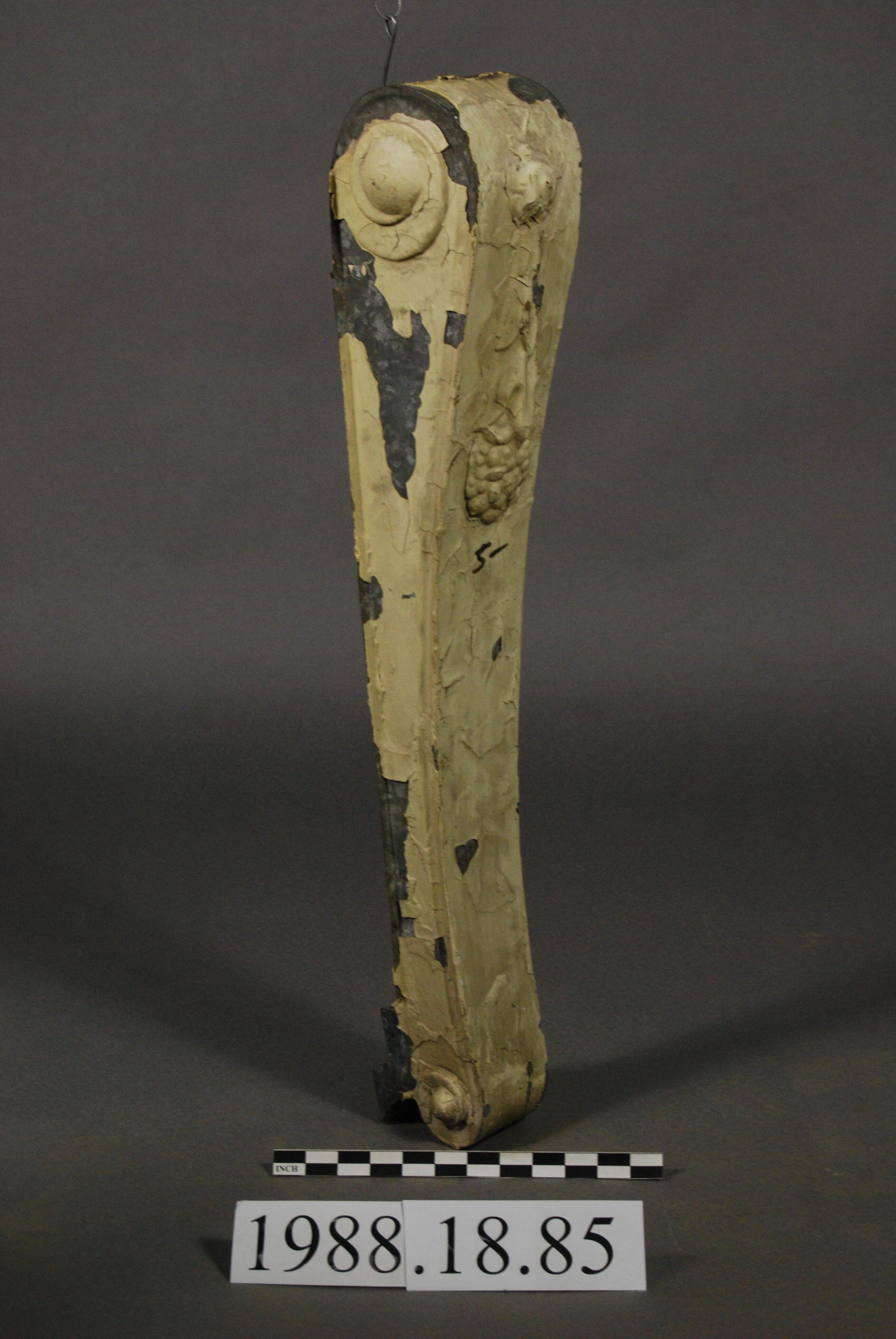 Galvanized sheet iron / steel Bracket. Has Floral / Foliated Pendant Motif on front. Scrolled sides at top and bottom.