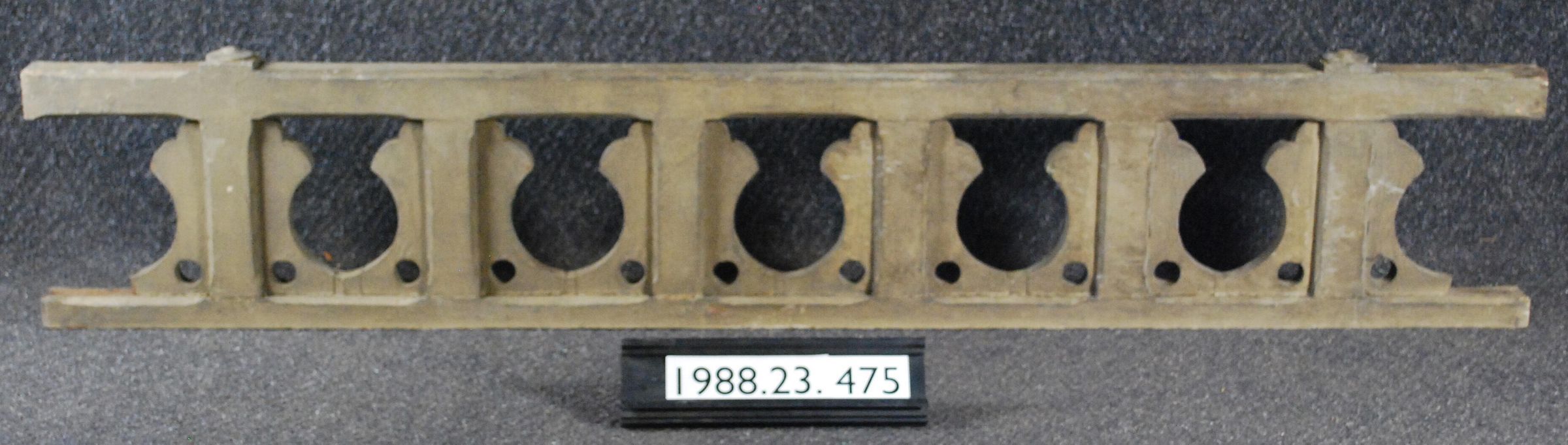 Exterior wood balustrade. Probably from porch. Composed of top and bottom rail. Joined by series of vertical stiles. Between stiles are series of counter-imposed brackets which together form moorish-style openings. Painted dark greenish / grey. Includes one lot of detached parts,