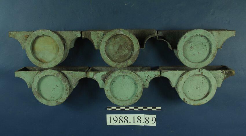 One lot of six galvanized sheet iron / steel Ornaments. Possibly from roof cornice. Cove at each end. Circular panel on one side painted green. Two ornaments have section missing and two have notches cut out of corners.