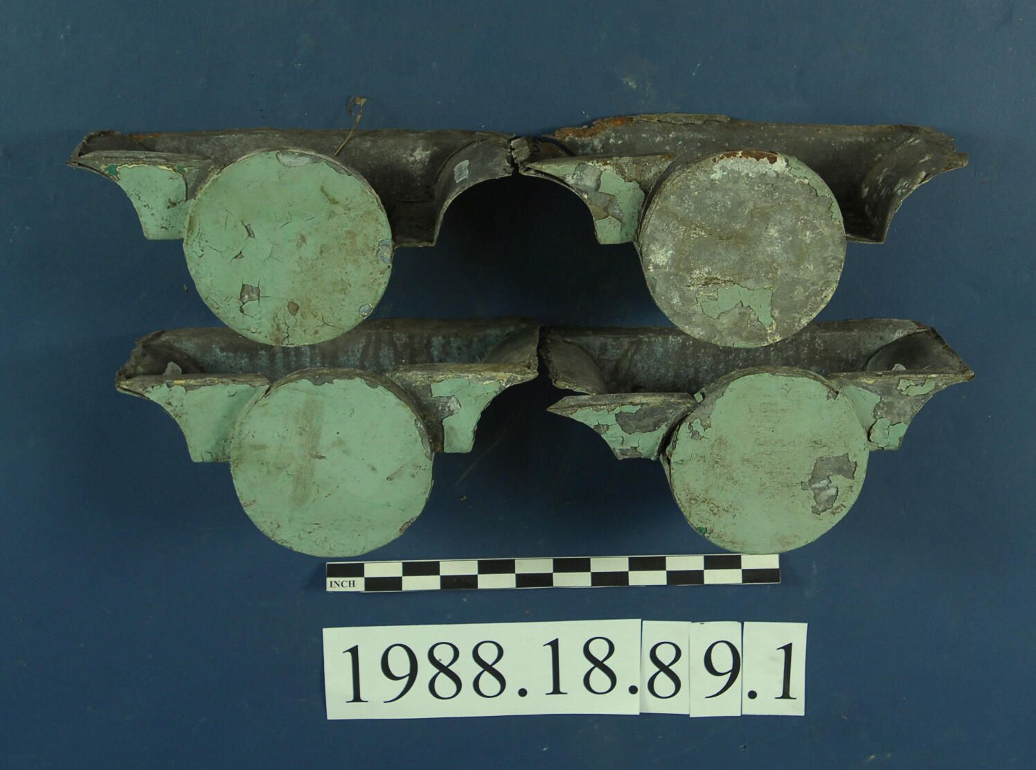 One lot of four galvanized sheet iron / steel Ornaments. Possibly from roof cornice. Cove at each end. Semi-cylindrical center. Three ornaments have sections missing. One has rusted-away corner.