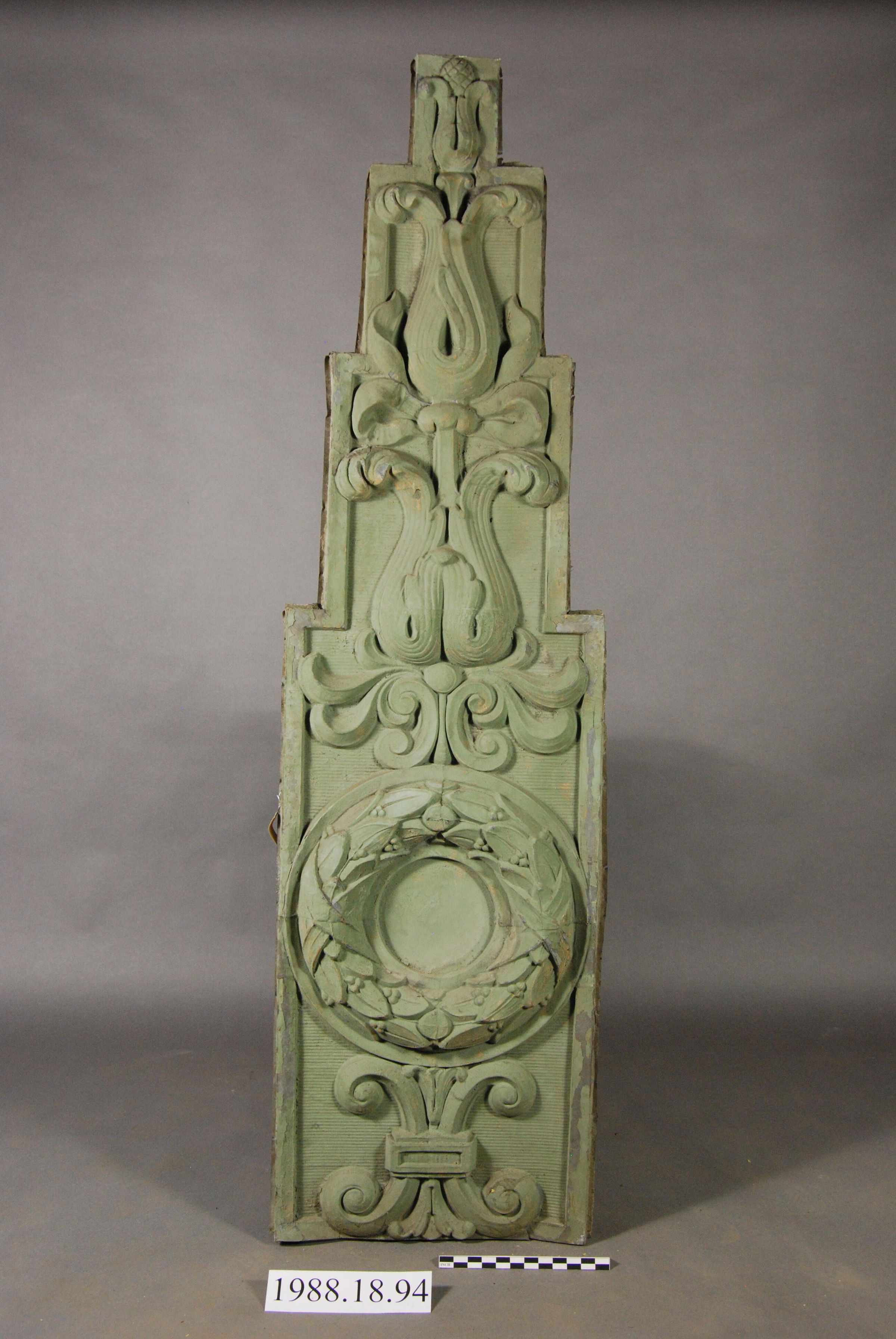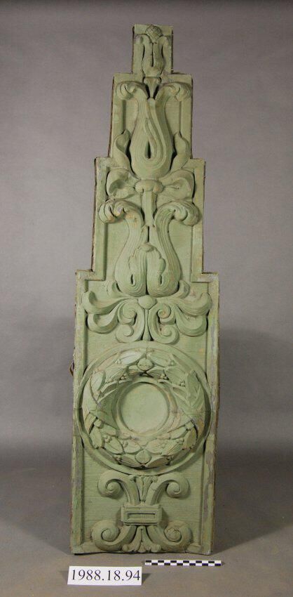 Die-stamped sheet zinc Ornament. Exterior building facade component. Rectangular. Stepped side edges. Elaborate Relief Motifs include: Scroll / Wreath / Botanical / Ribbon / Husk and Pineapple. Recessed panels with corrugated background. Painted green.