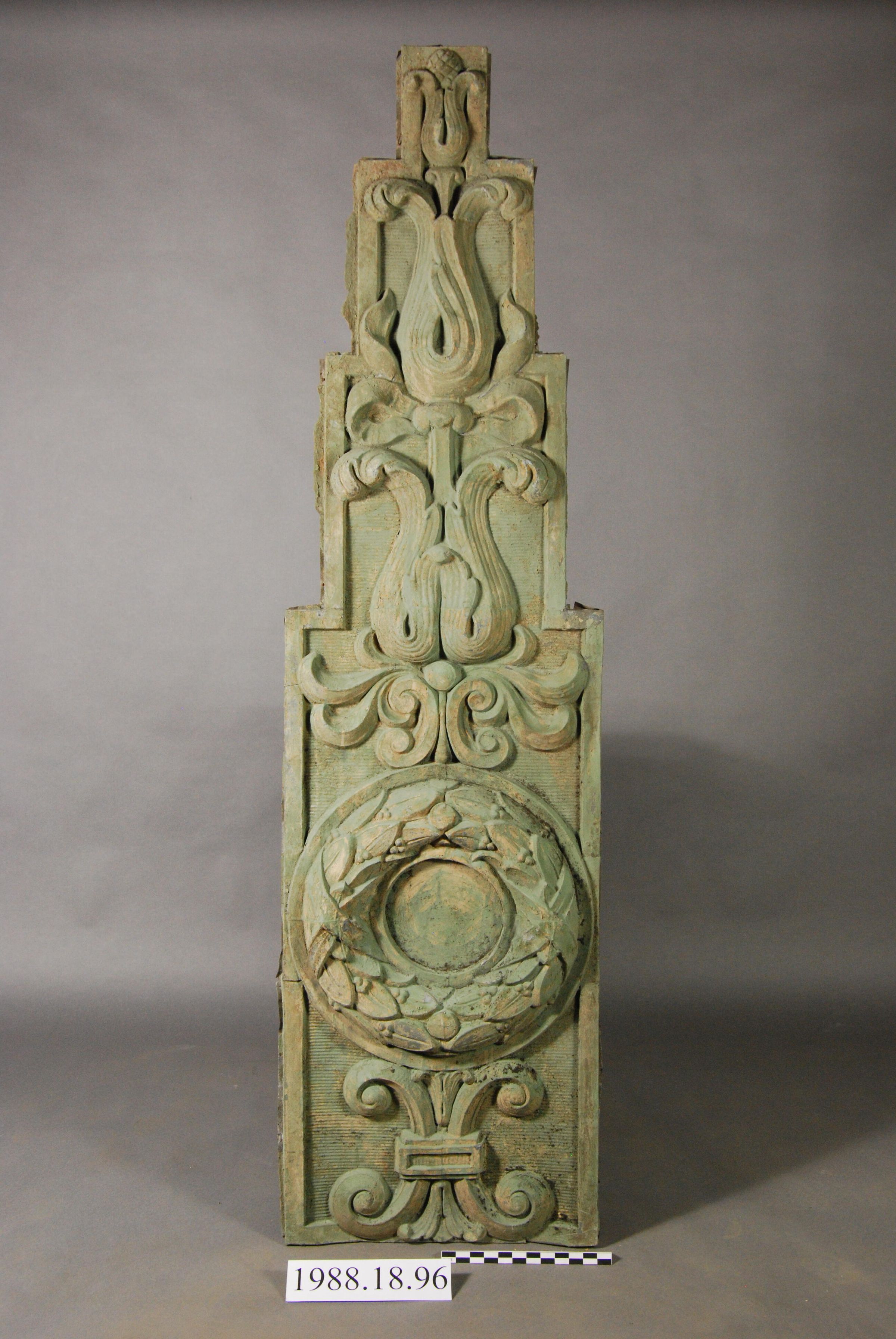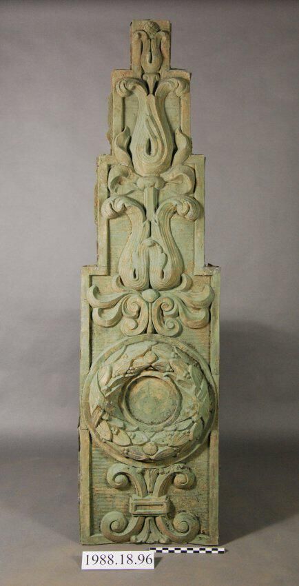 Die-stamped sheet zinc Ornament. Exterior building facade component. Rectangular. Stepped side edges. Elaborate Relief Motifs include: Scroll / Wreath / Botanical / Ribbon / Husk and Pineapple. Recessed panels with corrugated background. Painted green.