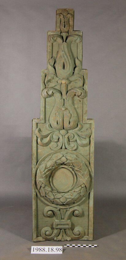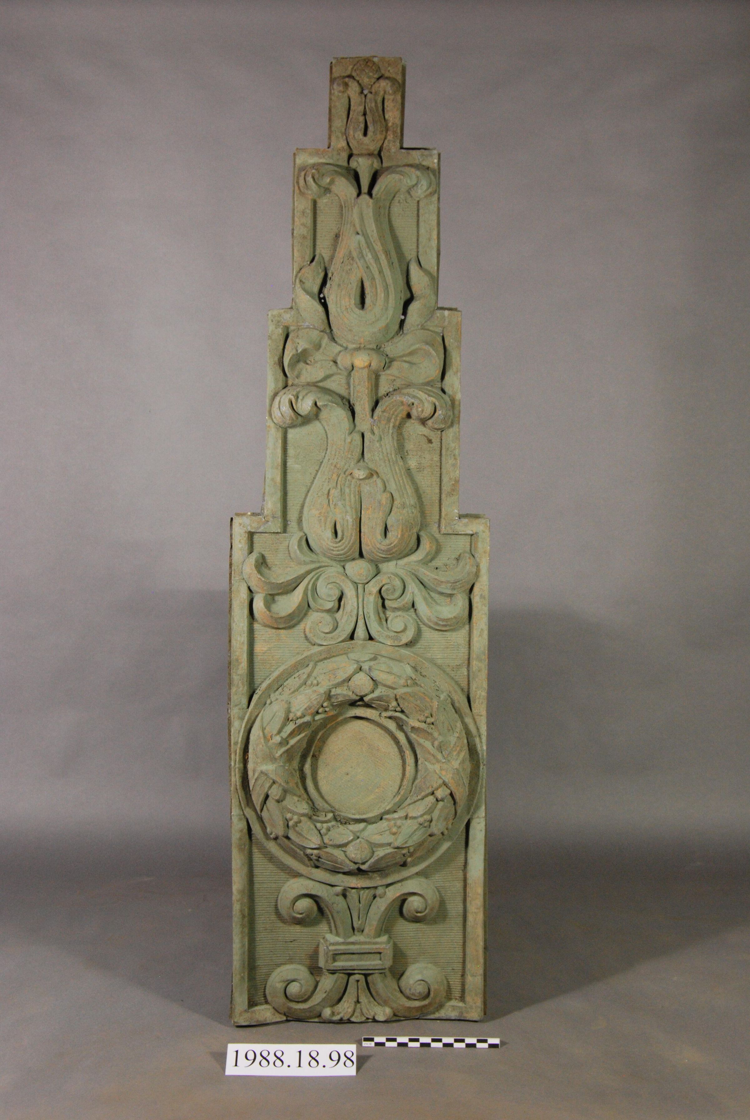 Die-stamped sheet zinc Ornament. Exterior building facade component. Rectangular. Stepped side edges. Elaborate Relief Motifs include: Scroll / Wreath / Botanical / Ribbon / Husk and Pineapple. Recessed panels with corrugated background. Painted green.