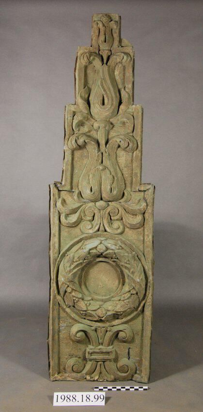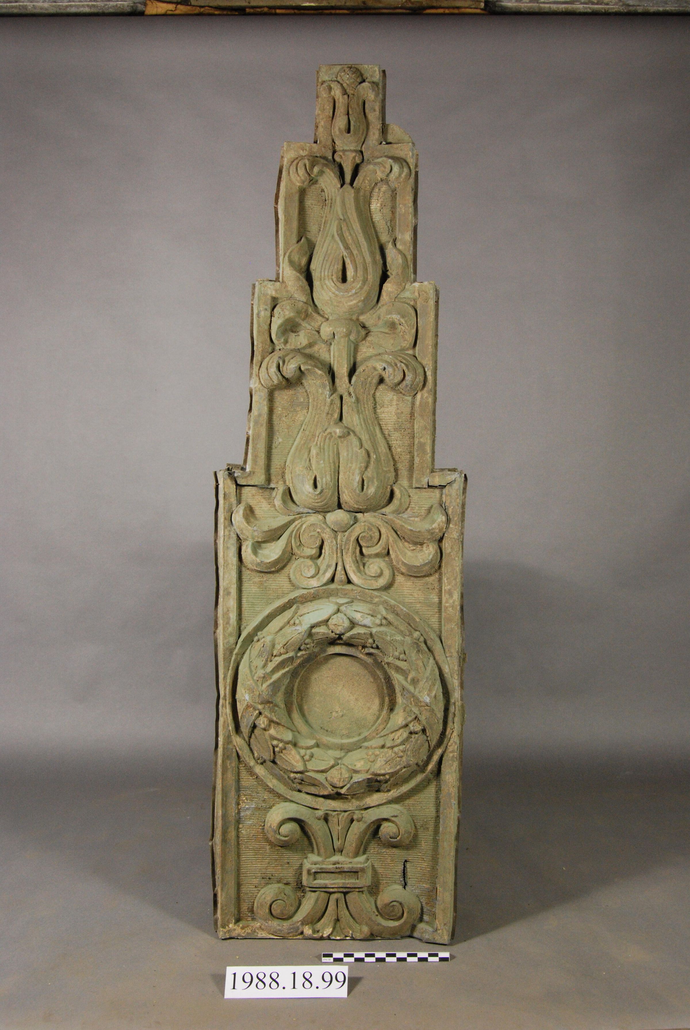 Die-stamped sheet zinc Ornament. Exterior building facade component. Rectangular. Stepped side edges. Elaborate Relief Motifs include: Scroll / Wreath / Botanical / Ribbon / Husk and Pineapple. Recessed panels with corrugated background. Painted green.