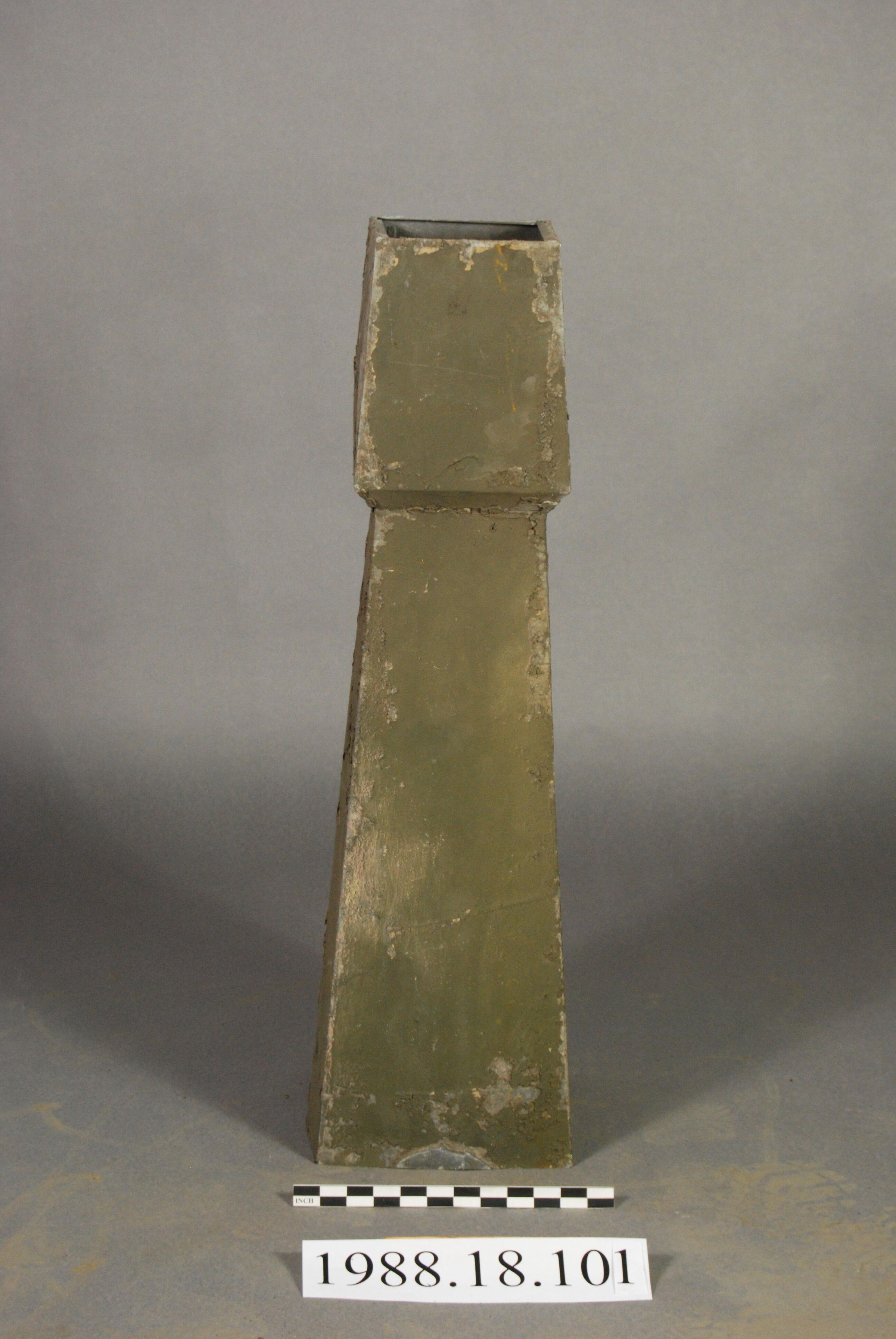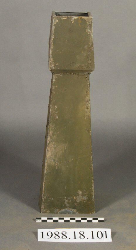 Galvanized sheet iron / steel hollow square tapered obelise-shaped. Stepped square tapered Finial. Open at both ends. Partition in upper end. Painted dark green. Unidentified exterior building component.