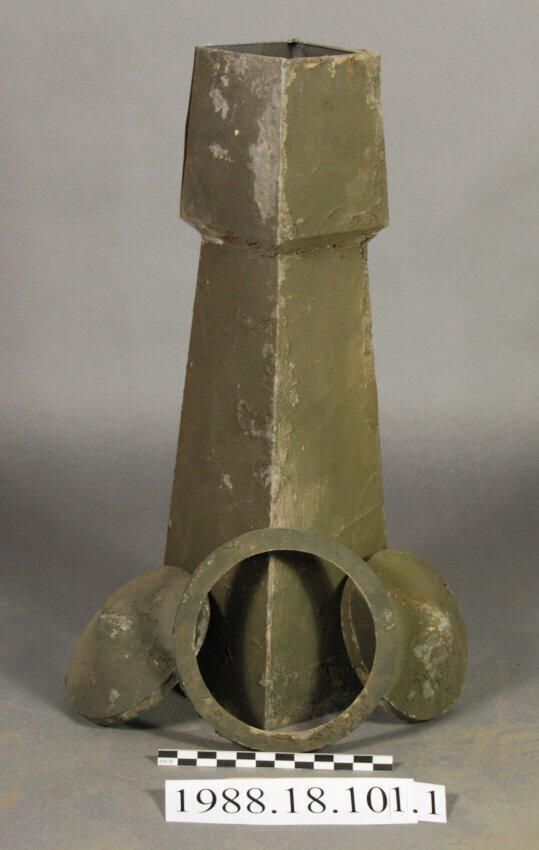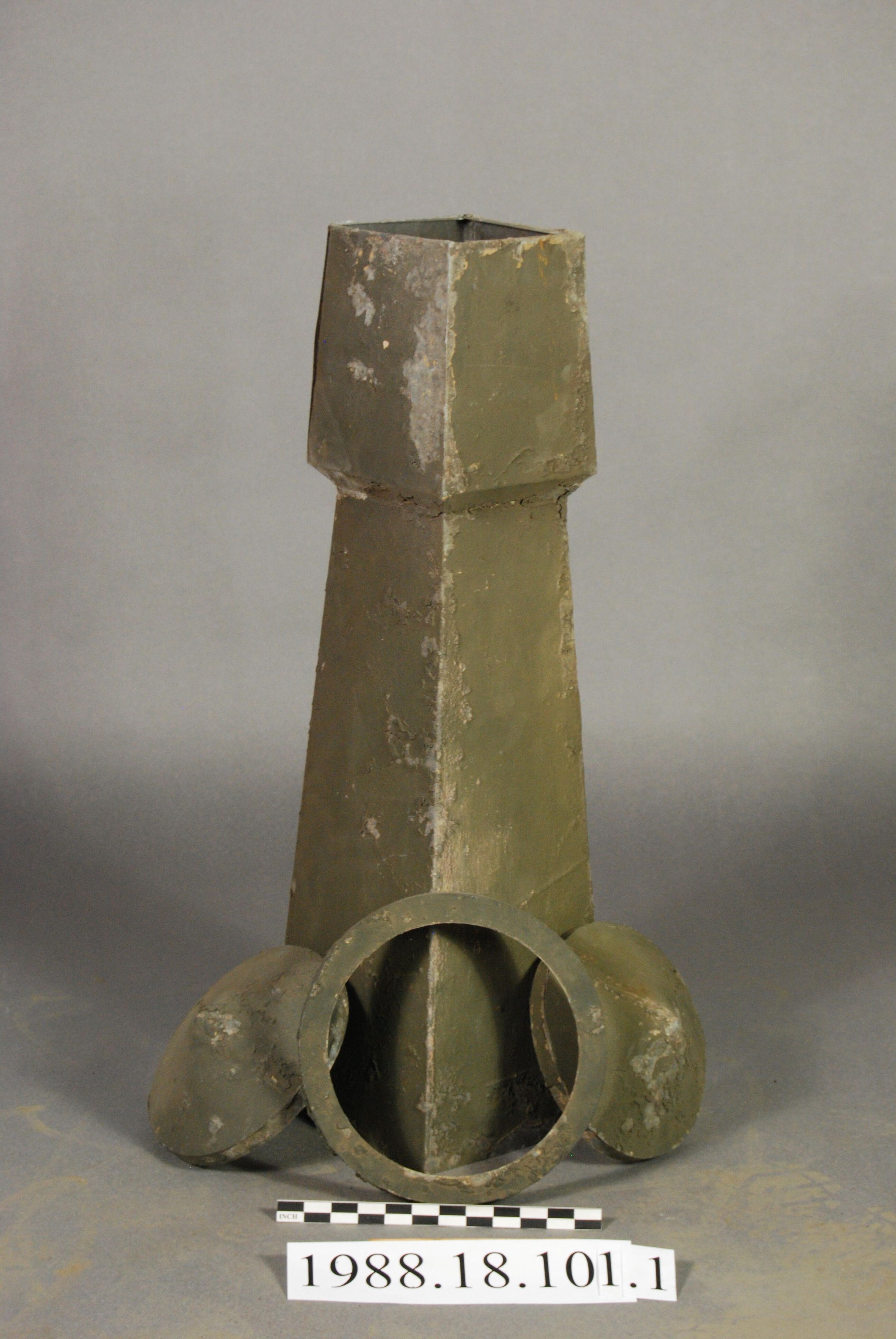 One lot of two Galvanized sheet iron / steel conical caps with soldered rims.One has flanged ring rim which is detached. Matches paint on 1988.18.100.
