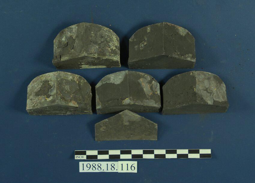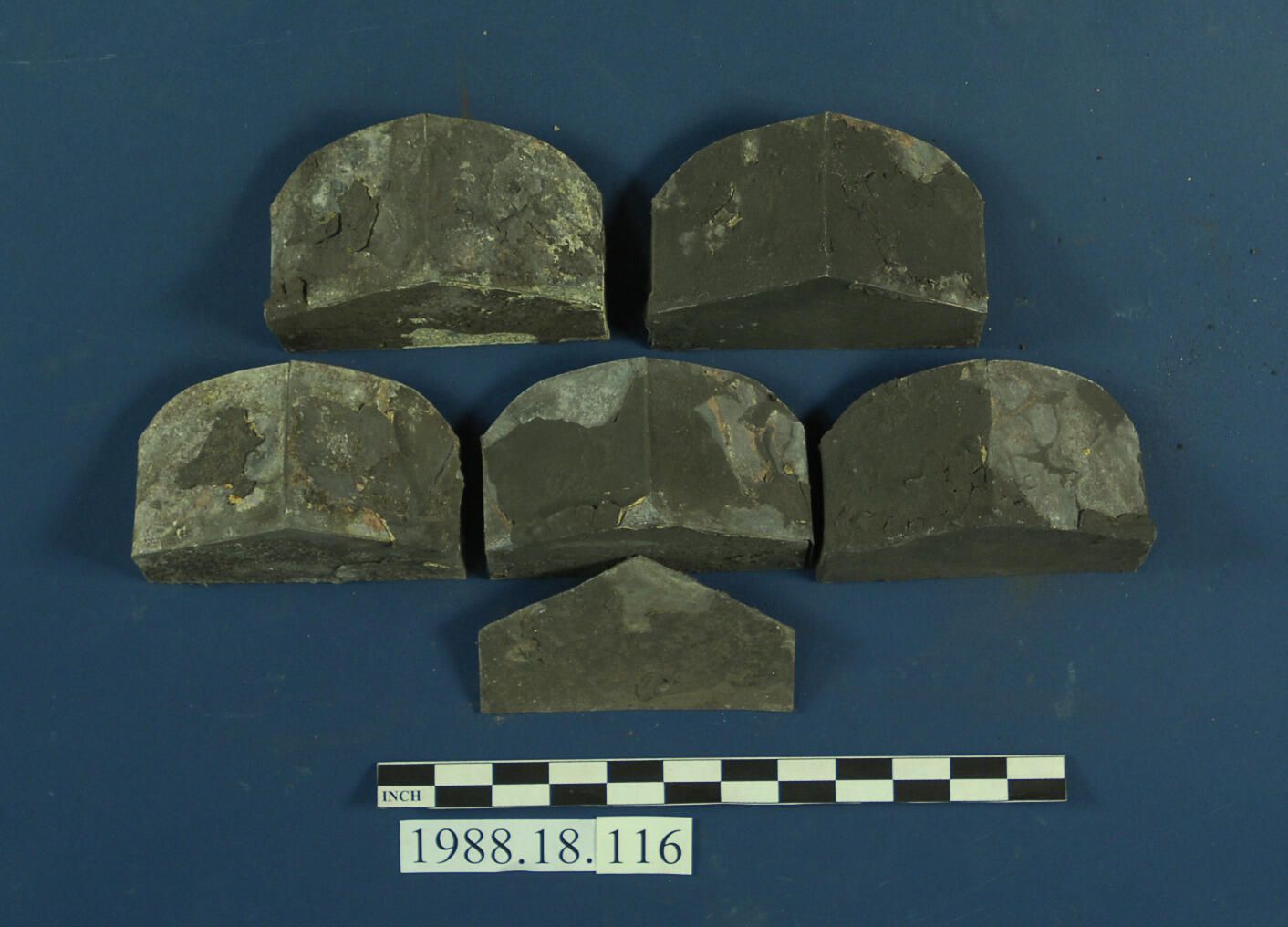 One lot of five galvanized sheet iron / steel angular hollow exterior unidentified building component. Shaped like gable. Paint matches 1988.101-101.1. Sides are missing on one piece.