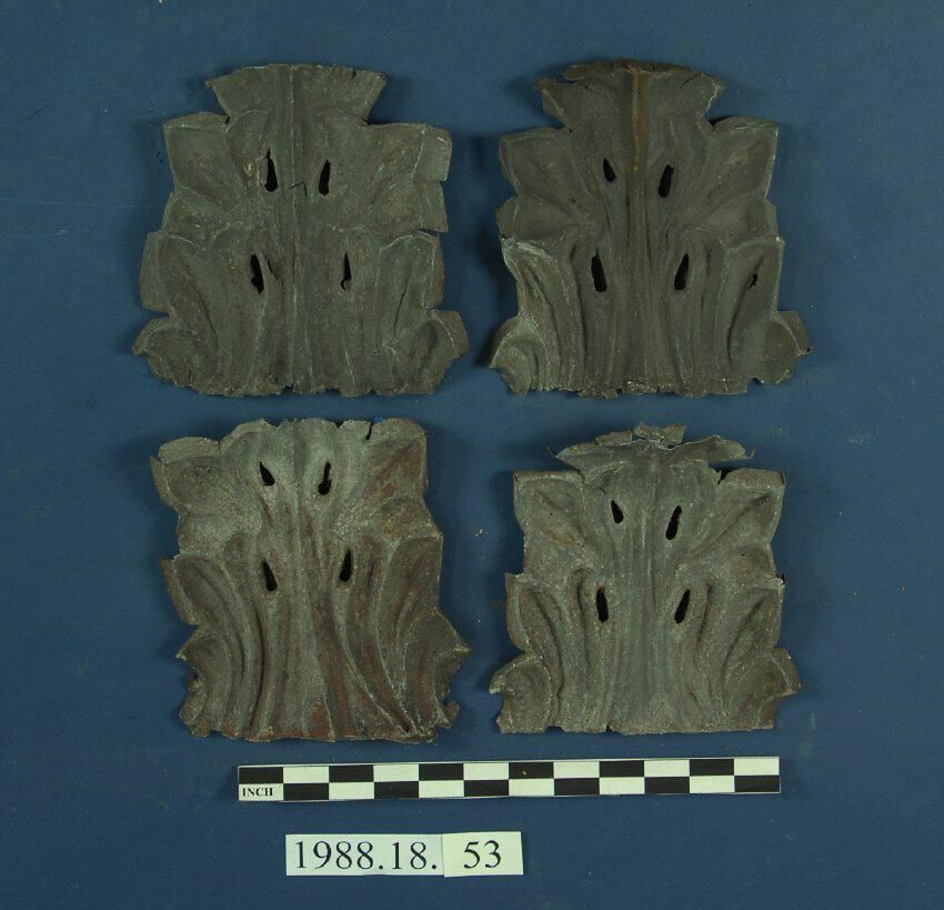 Four die-stamped zinc sheet metal ornaments. Acanthus Leaf Motif. Remnants of Paint.