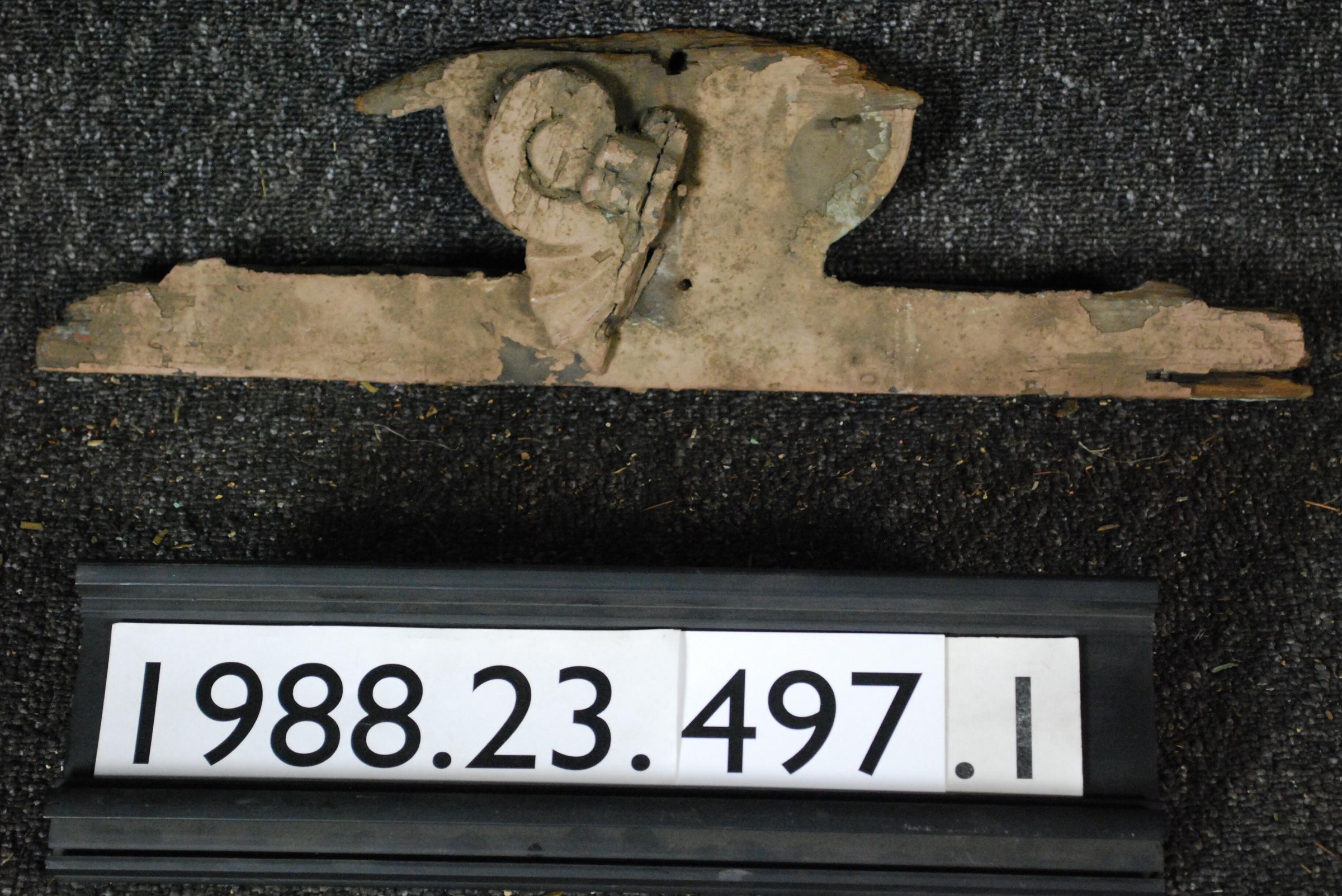 Exterior wood window header fragment. Painted Beige. Same as 1988.23.497 but incomplete.