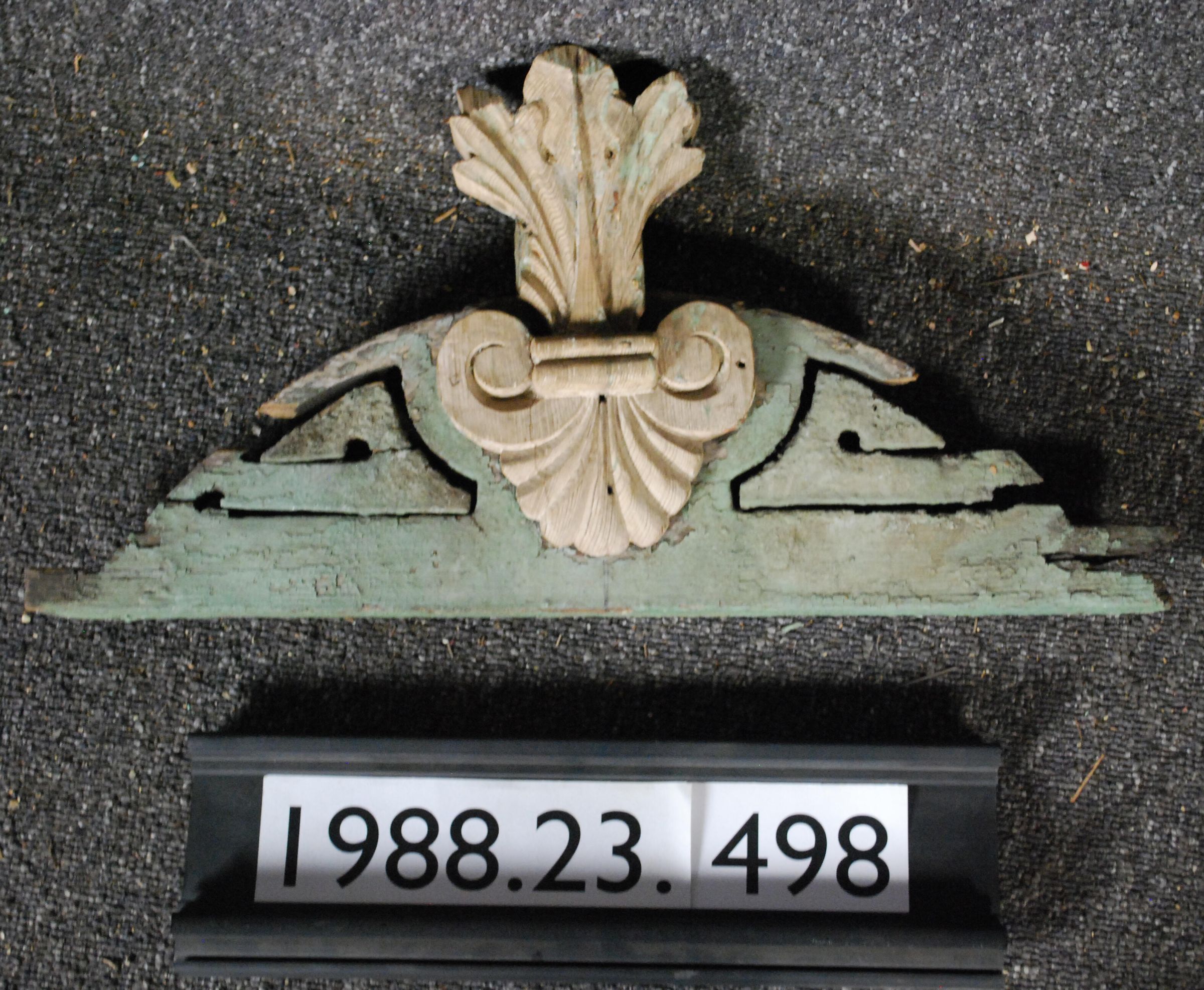 Exterior wood window header. Arched top. Fret-cut ornament on front. Detached carved botanical ornament. Same pattern as 1988.23.497 but painted green. Partially stopped from ornament.
