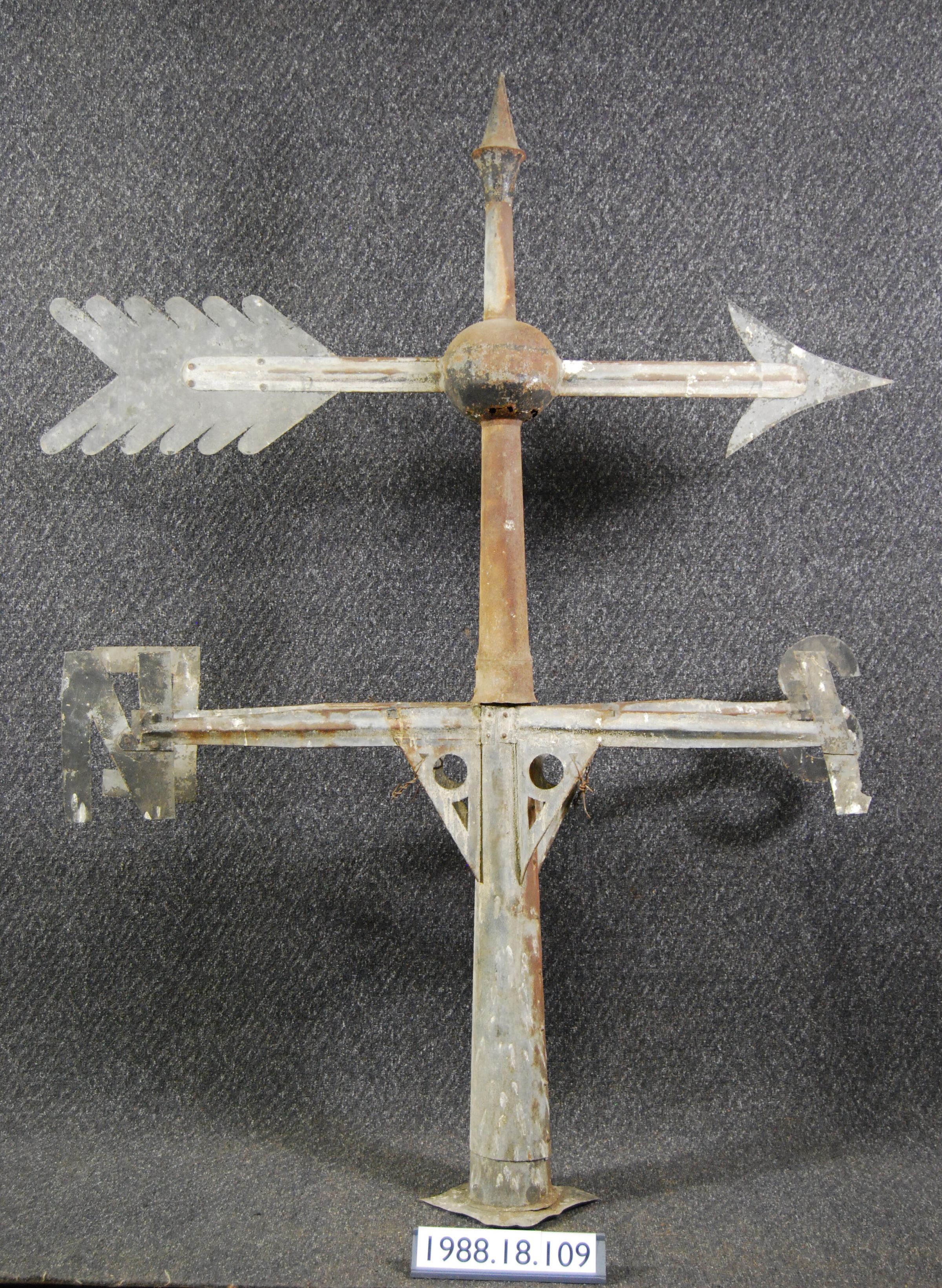 Galvanized sheet iron / steel Weather Vane with hollow tapered vertical shaft. Conical finial on top. Directional arrow with scalloped feather motif. Vane attached to horizontal shaft. Flared pointer attached at other end of shaft. Mid-point of arrow has hollow spherical ball. Pivot bearing inside.