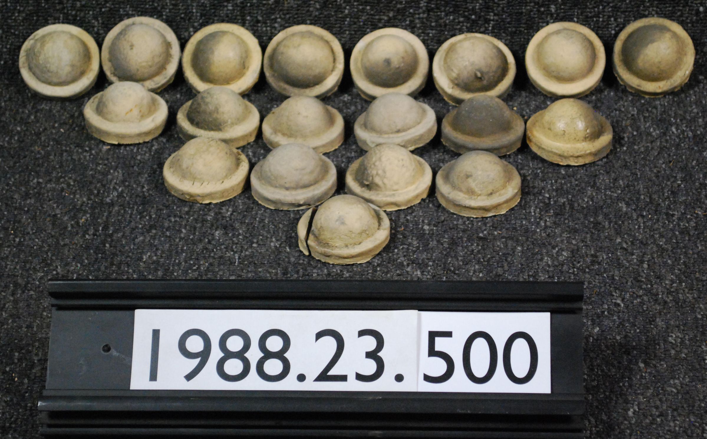 Nineteen exterior wood ornaments. Each is circular with half-domed front. One is broken. Probably originally part of window header ornamentation. All are painted beige / tan.