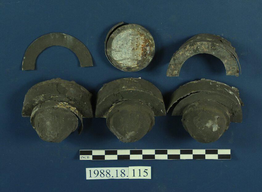 One lot of nine Galvanized iron / steel Ornaments/fragments. Three are half spheres with soldered rim, sphere is missing on fourth piece.The remaining five pieces are half circles, four of which have backing flange.The remaining piece is without backing flange. Painted multiple layers - lastly dark grey.