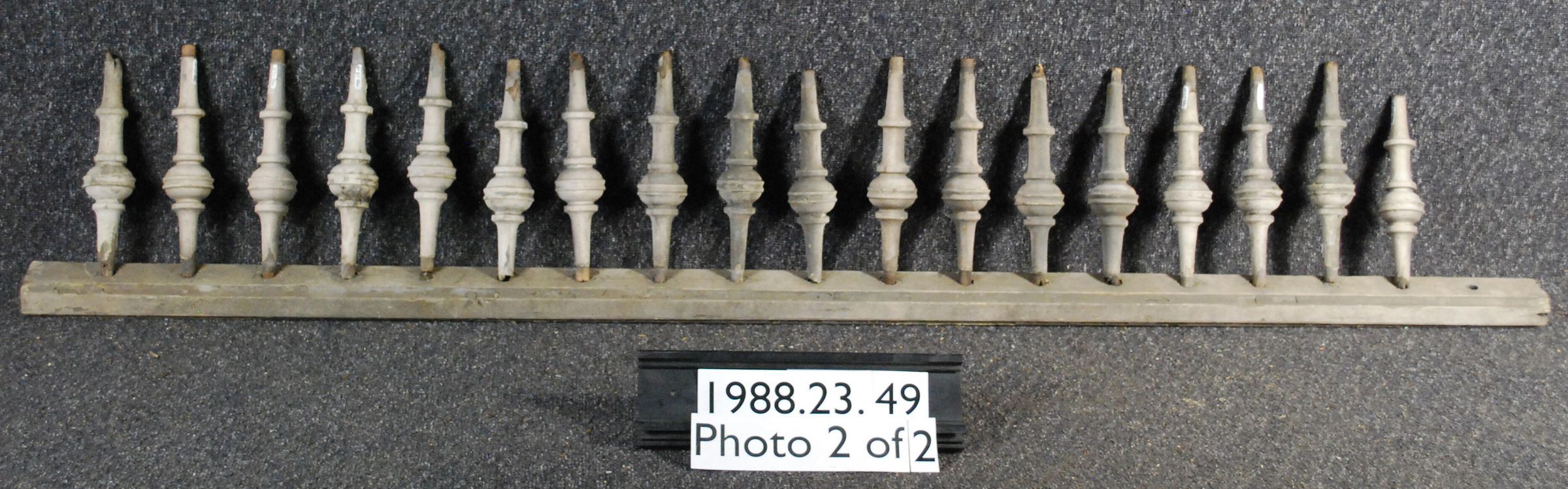 Exterior wood spindlework, includes rail and a total of eighteen turned spindles which are now detached from rail. painted grey/beige. Manufacturer: Place of Manufacturer: Design motif: Style: Finish: Painted