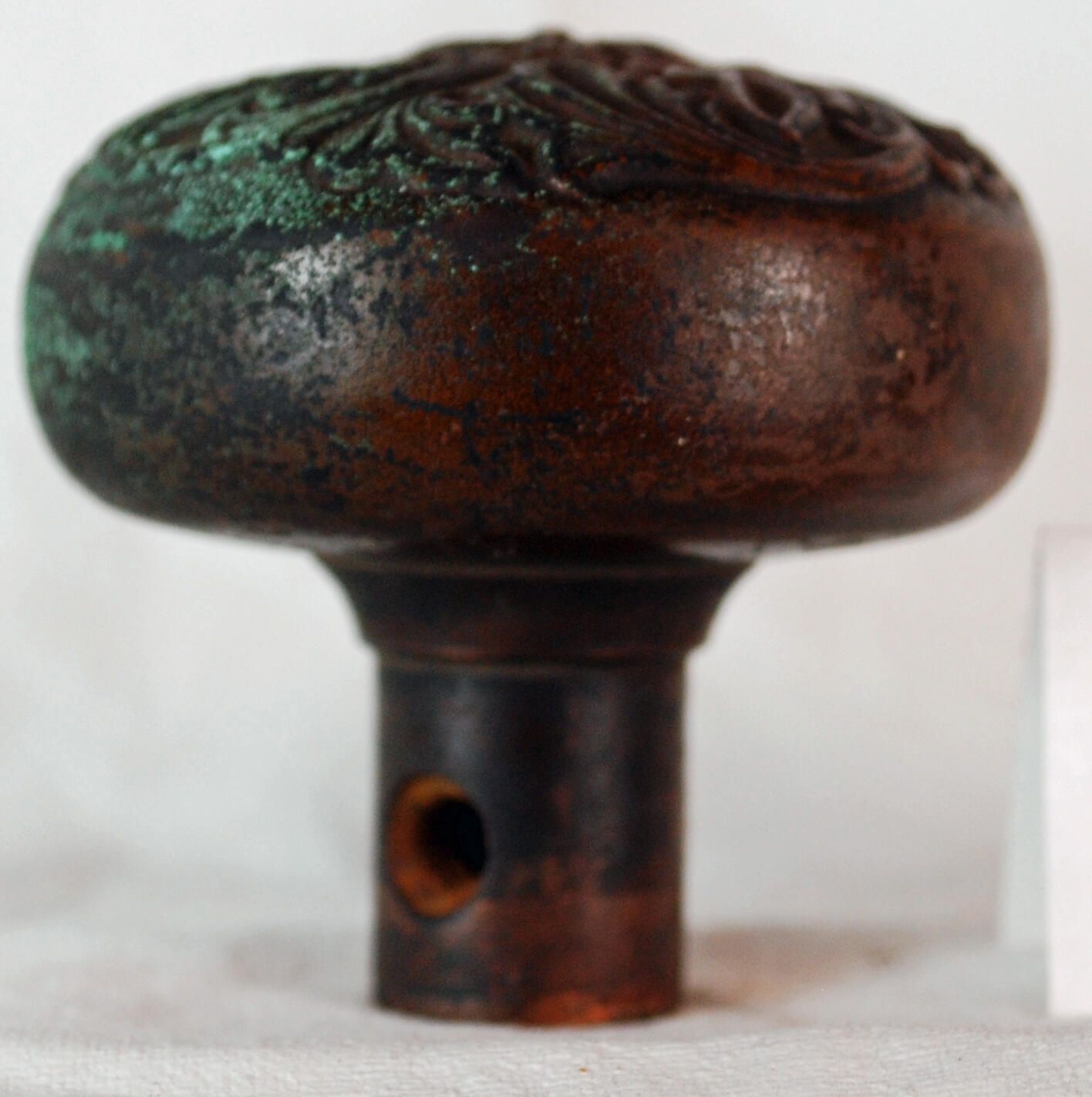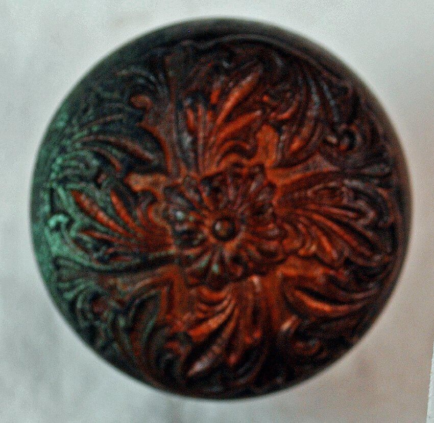 Design Name: Panama Manufacture: Barrows Lock Co. Style: Romanesque Material: Bronze Manufacturing Method: Cast Surface Finish: Unpolished VDA Classification: Spirals & Swirls VDA Number: E-117 Shape: Domed Patent Specifics: Lock Type (If Applicable): Inscription/Makers Mark: Inscription Text: Comments: Heavy green oxidation on one side.