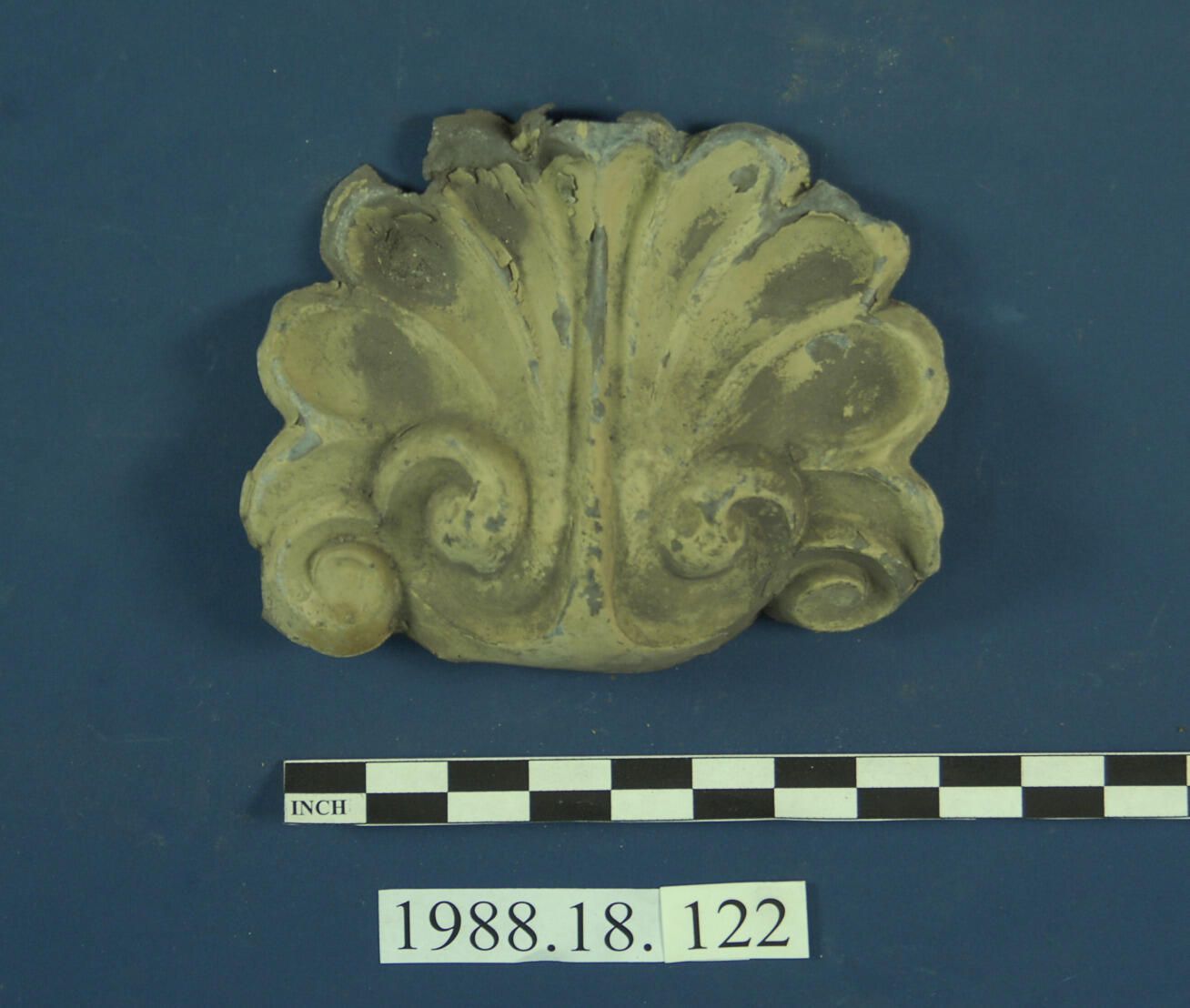 Die-stamped zinc sheet metal Ornament. Fluted and Scrolled Botanical Motif. Scalloped edge. Painted beige.