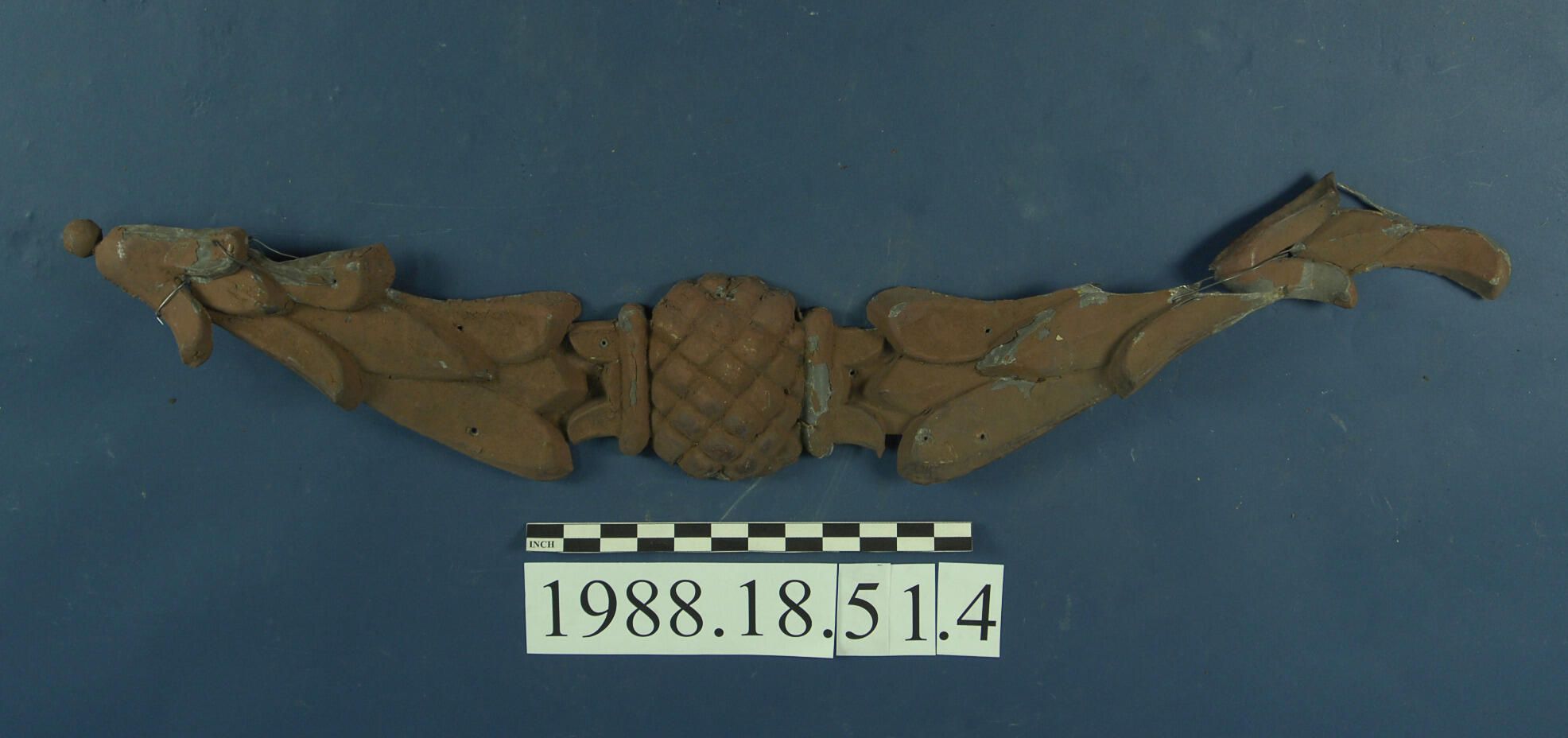 Die-stamped zinc sheet metal ornament with central Pineapple Motif and Botanical Swag or Garland at each end, composed of multiple segments soldered together. Ornament broken at both ends. Painted dark red.