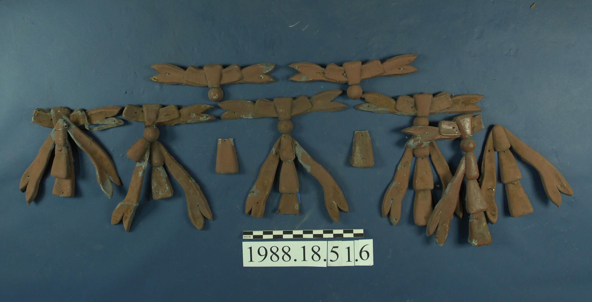 One lot of twelve die-stamped sheet zinc ornaments and fragments of ornaments of same pattern. Botanical Motif. Swag or Garland drops. Painted dark red.