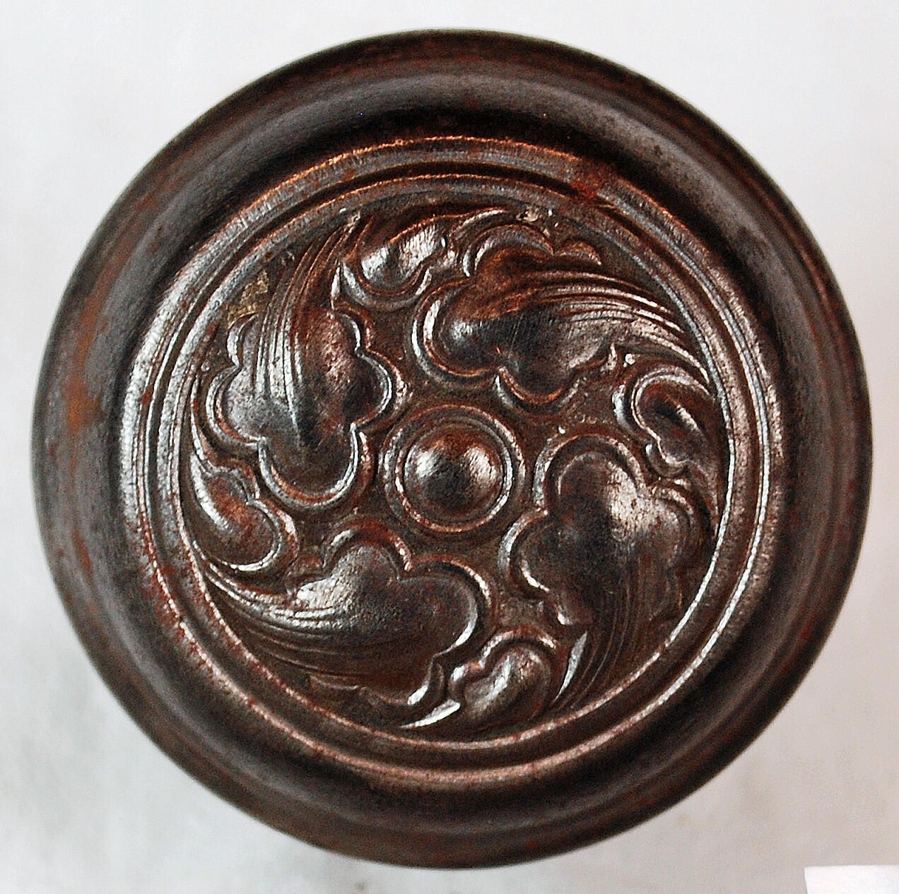 Design Name: Manufacture: Style: Arts and Crafts Material: Steel Manufacturing Method: Wrought / Stamped Surface Finish: Texured / Unfinished VDA Classification: Spirals and Swirls VDA Number: E 191 Shape: Domed Patent Specifics: Lock Type (If Applicable): Inscription/Makers Mark: Inscription Text: Comments: Borderline - poor