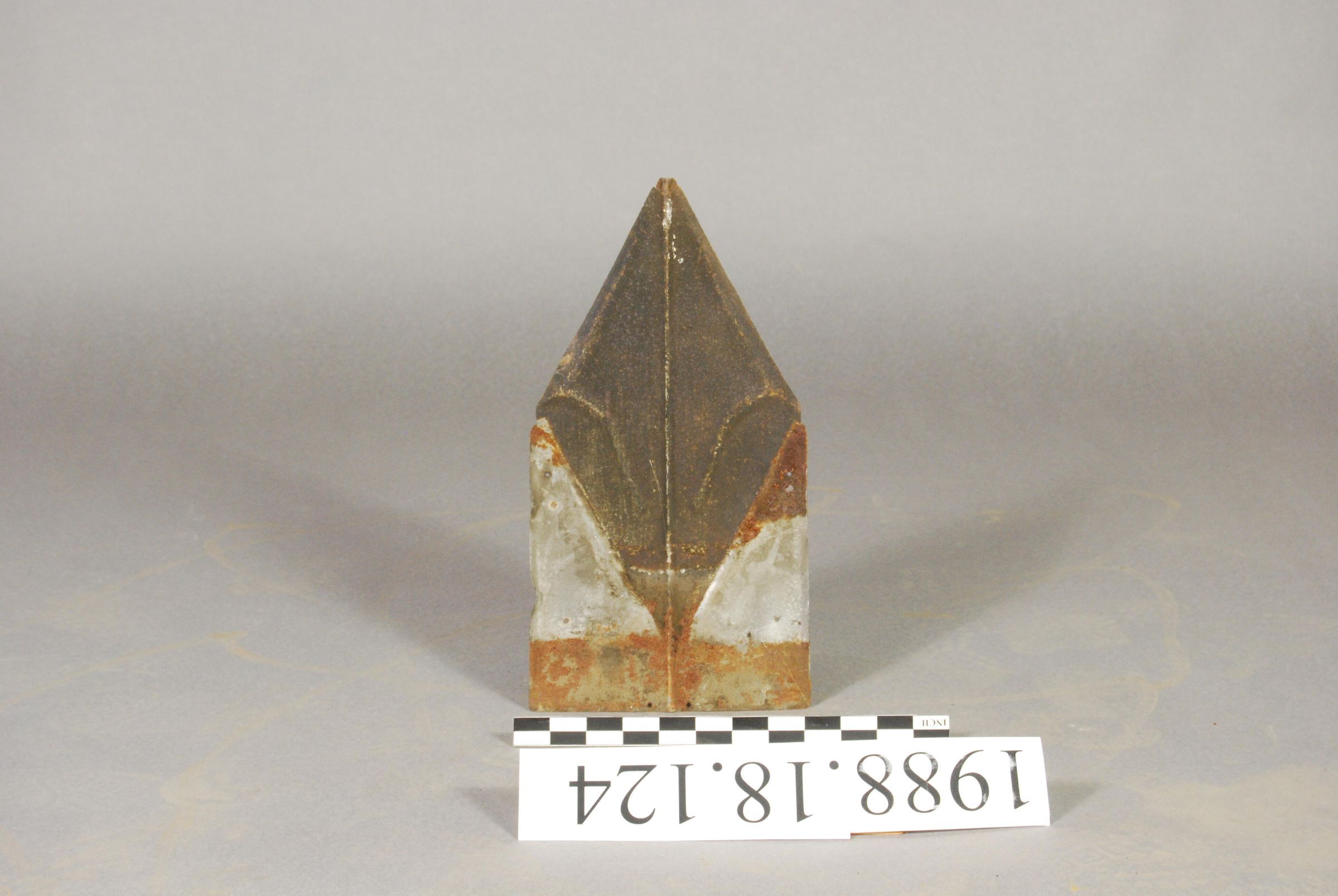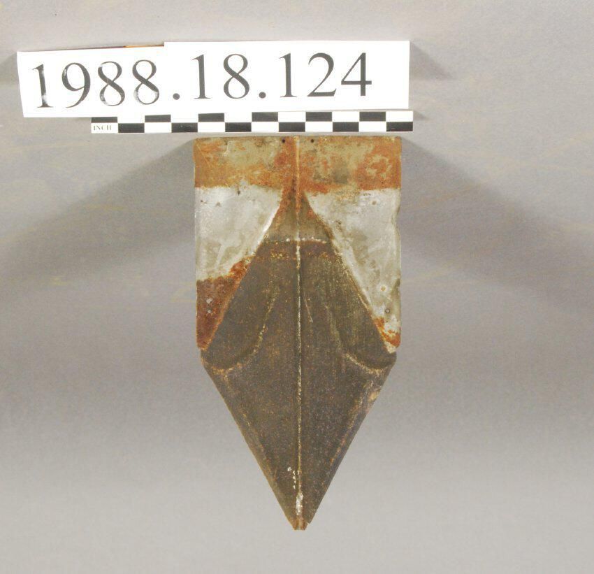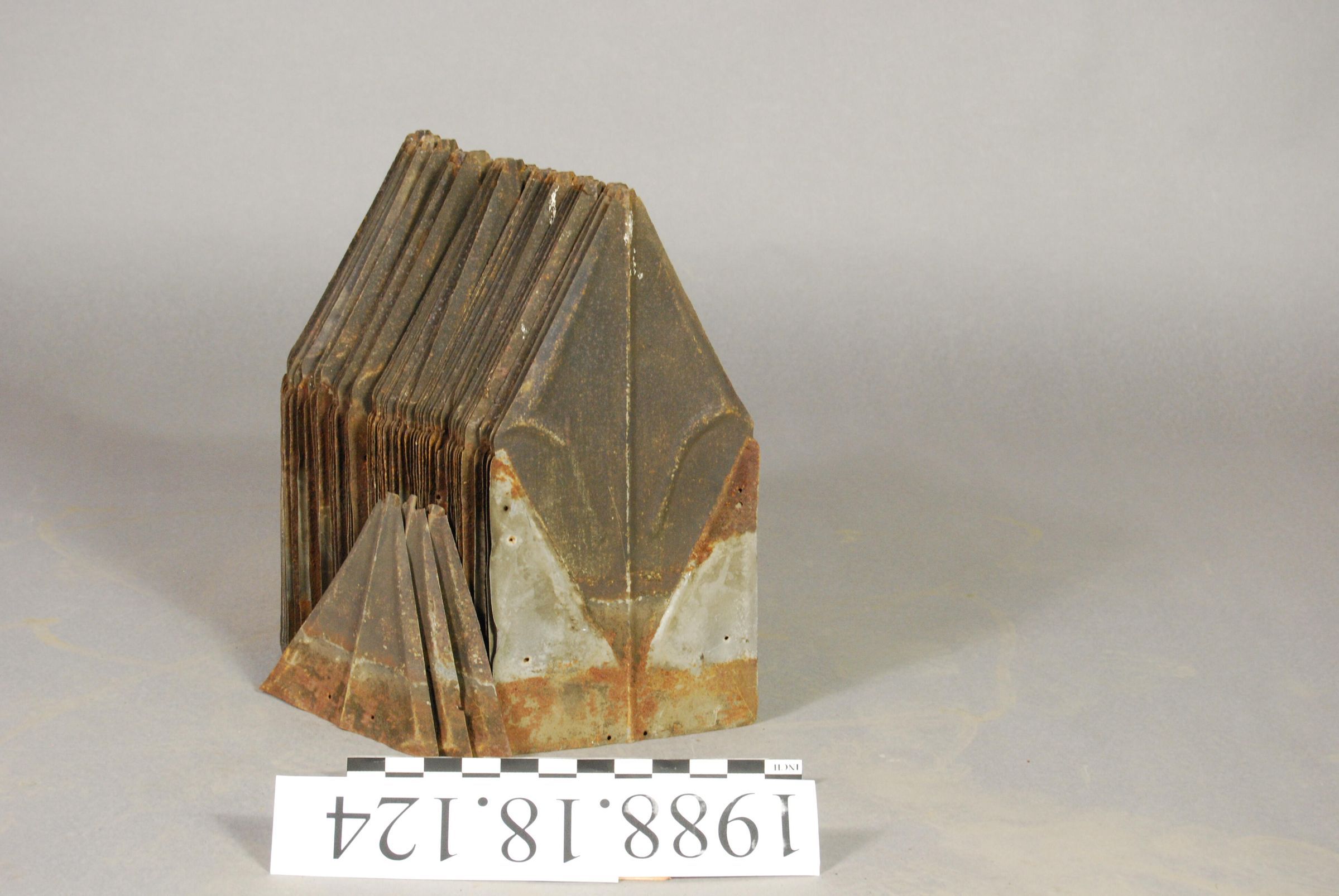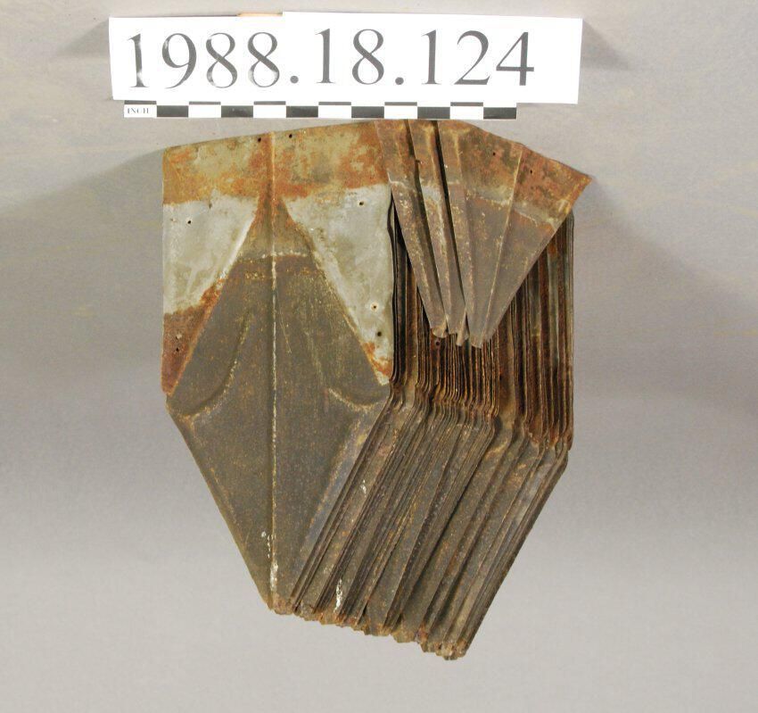 One lot of seventy-nine die-stamped sheet iron / steel shingles. Upper end is rectangular. Lower end converges to point. Has series of ridges for decoration and reinforcement. Plated with unidentified white metal. (Possibly terne plated). Originally mounted with square nails (few extant). Together, shingles would form fish scale or brocade pattern. Count includes three triangular pieces 7 inches in length.