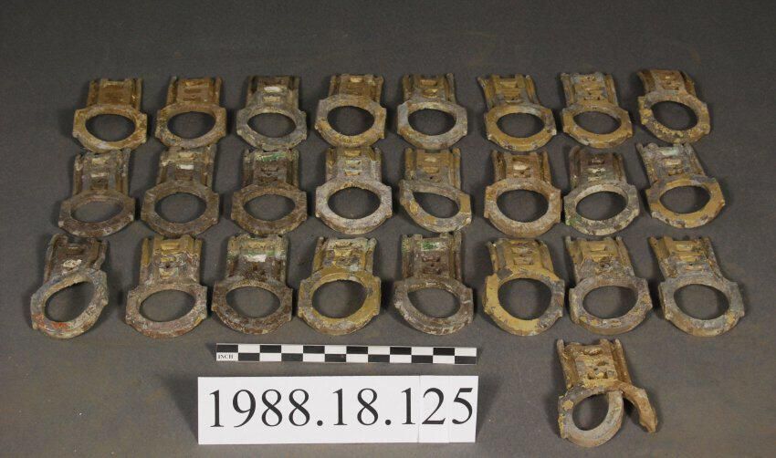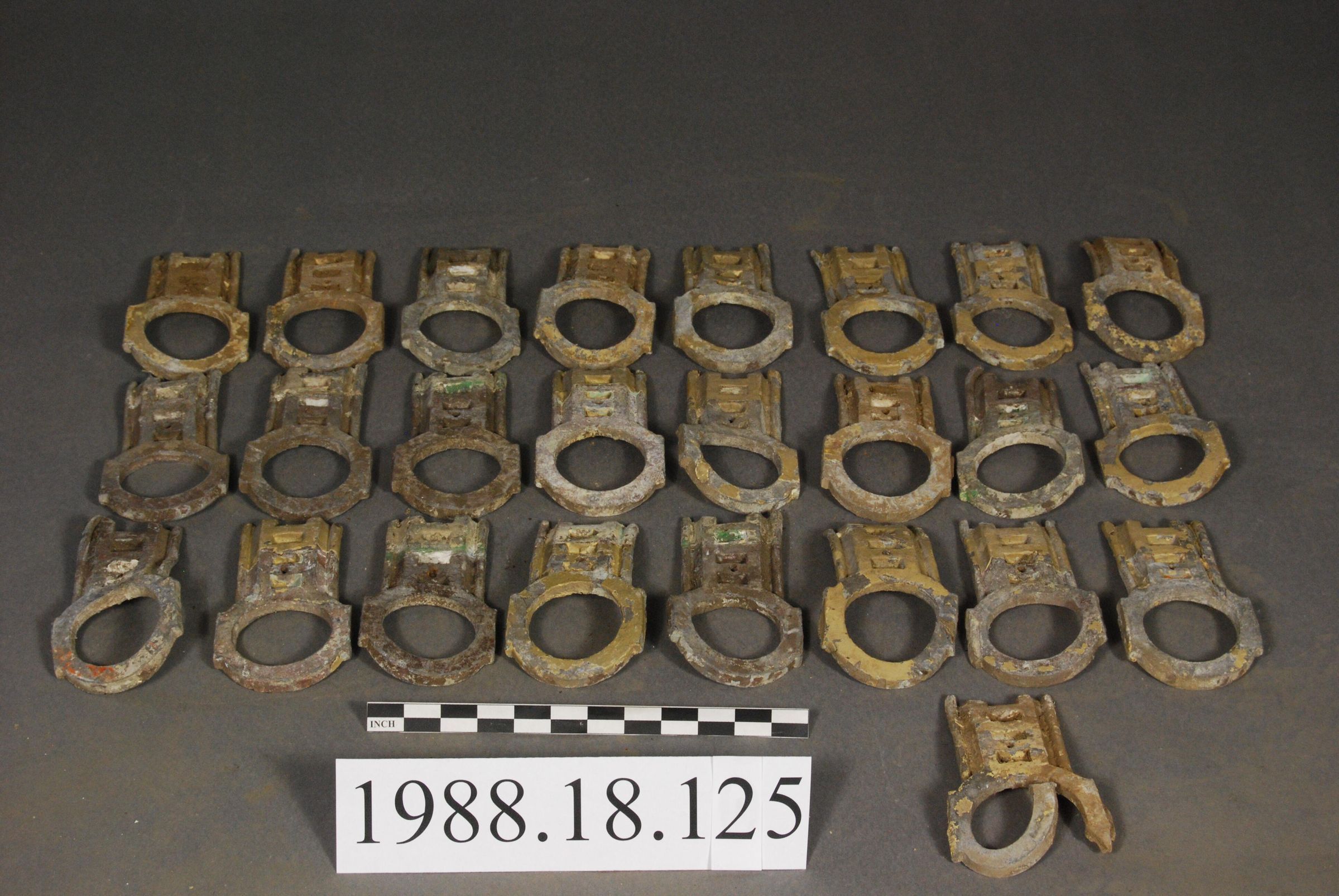 One lot of cast lead unidentified objects. Originally flat. Now distorted. 2.75 inch diameter. Round eyelet at one end. Each object has series of rectangular indents and ridged edges. Remnants of yellow and green paint.