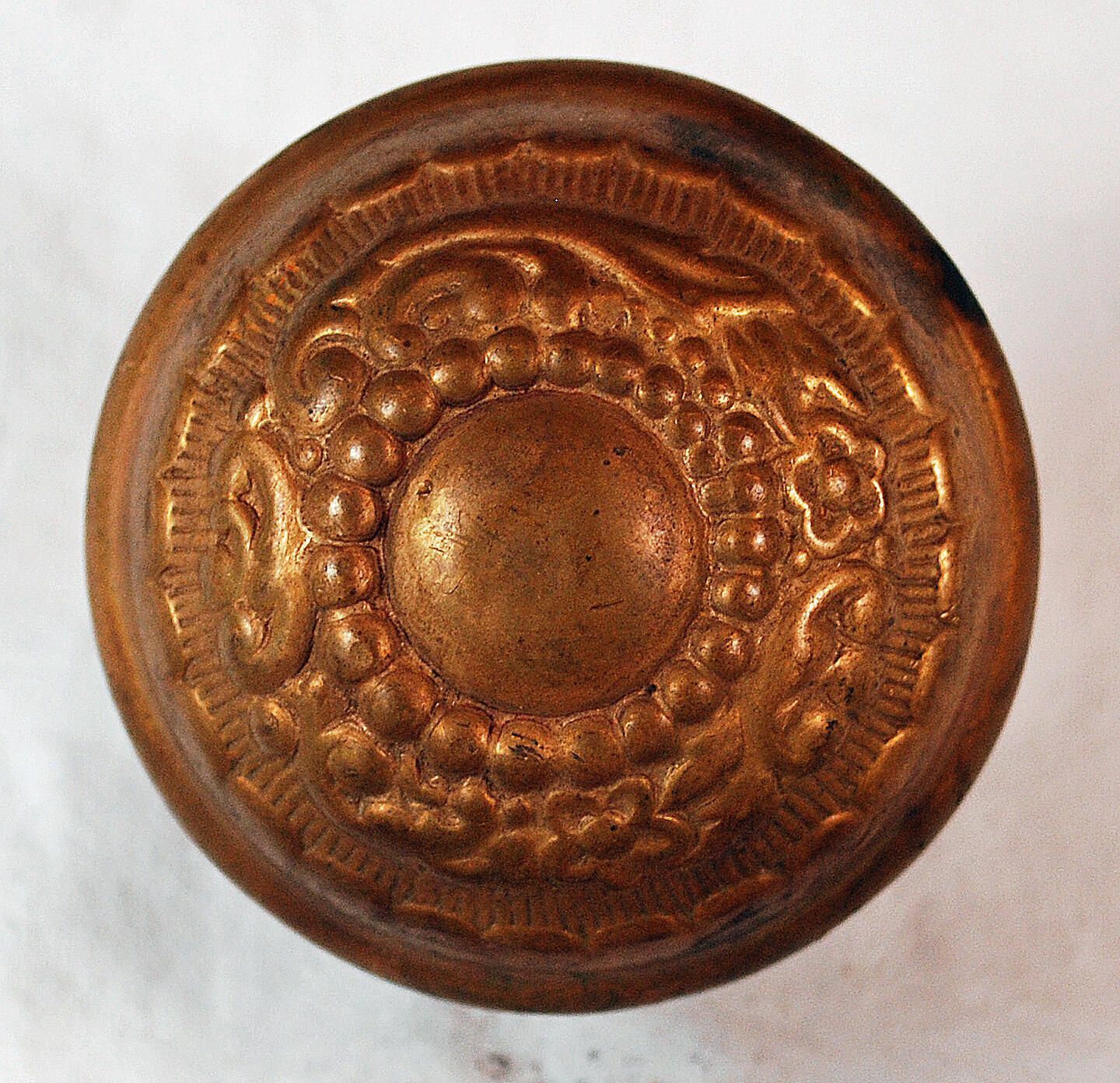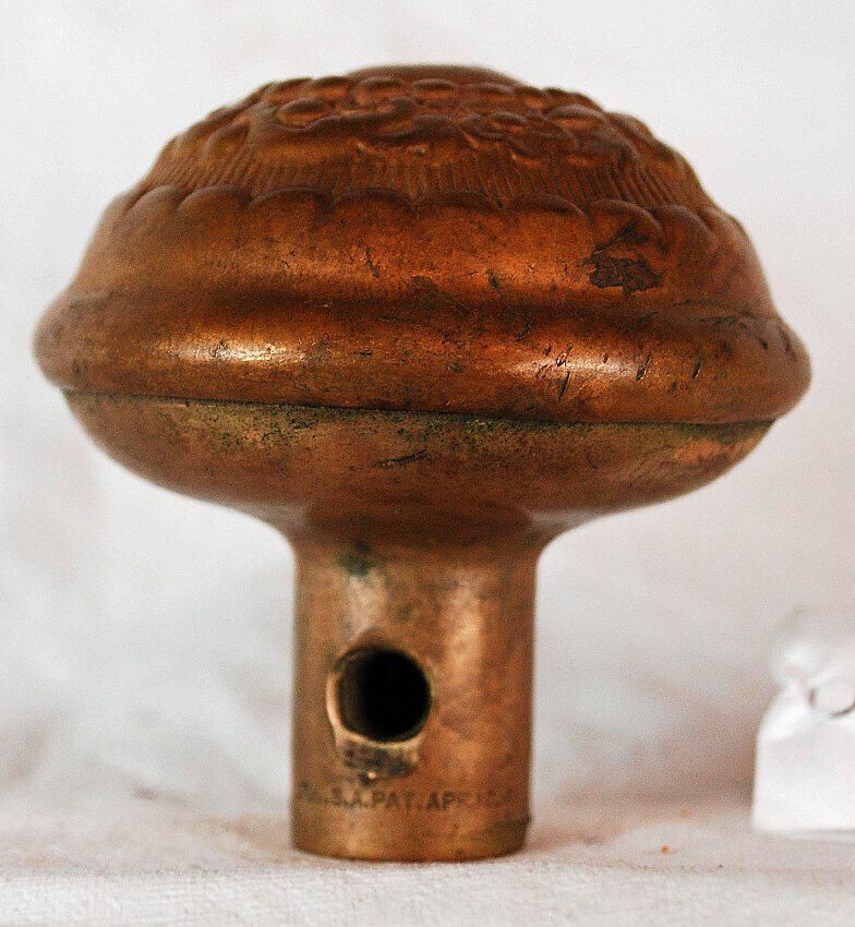 Design Name: Arabian Manufacture: Russell & Erwin Mfg. Co. Style: Material: Brass Manufacturing Method: Wrought / Stamped Surface Finish: unpolished VDA Classification: Asymmetric VDA Number: B - 302 Shape: Domed Patent Specifics: Lock Type (If Applicable): Inscription/Makers Mark: Inscription Text: Russell & Erwin Mfg. Co., New Britain, Ct. U.S.A. Pat Apr. 12, 92 Comments: Two Piece Construction