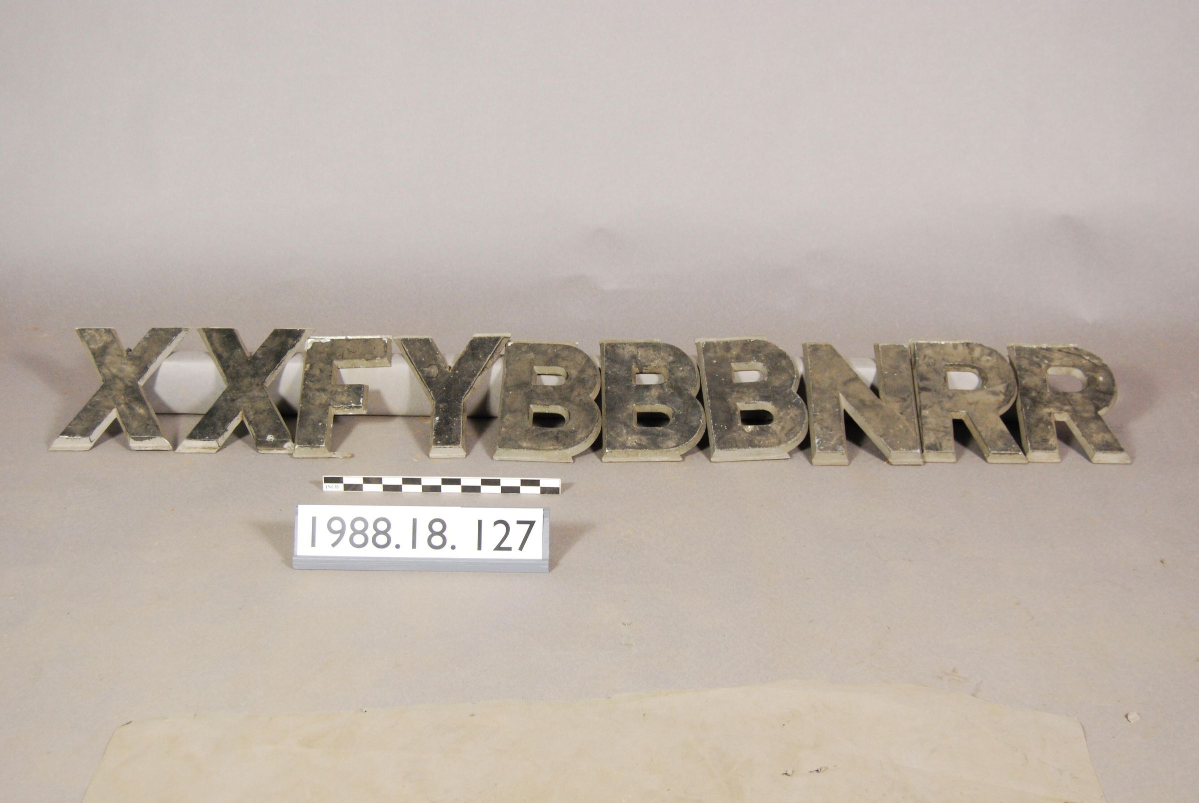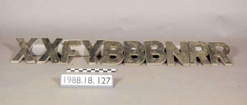 One lot of ten die-cast white metal (zinc alloy?) sign letters. Each reverse side has embossed manufacturer''s mark: "Manufactured by Adler Sign Letter Co., Chicago, U.S.A. - London, ENG. Pat. No. 2,03B,978."