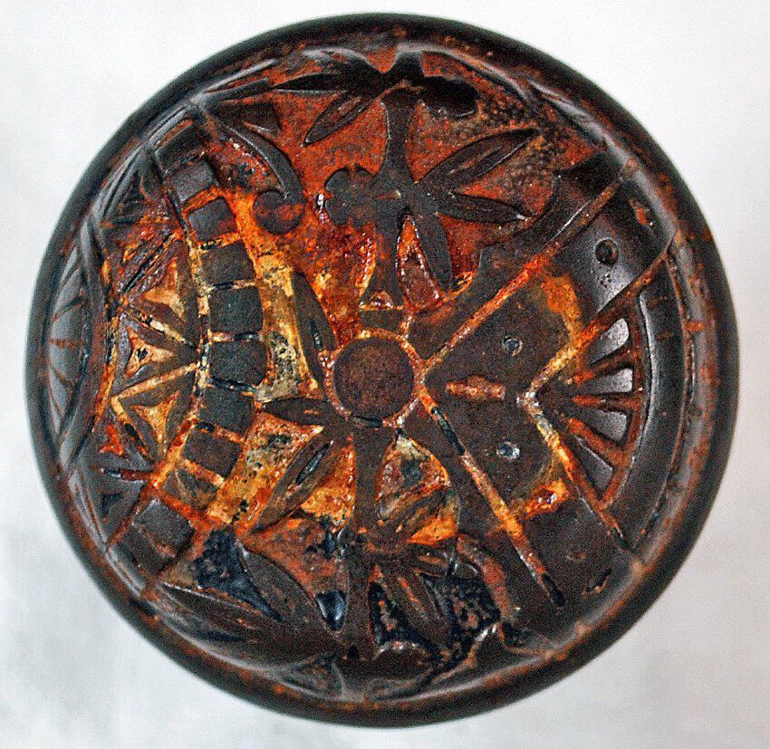 Design Name: Oriental Manufacture: Branford Lock Works Style: Aesthetic Material: Iron Manufacturing Method: Cast Surface Finish: VDA Classification: Asymmetric VDA Number: B - 117 Variartion Shape: Domed Patent Specifics: Lock Type (If Applicable): Inscription/Makers Mark: Inscription Text: Comments: On Top.