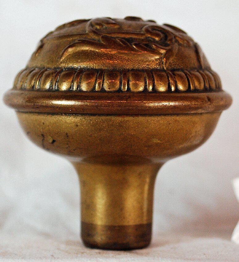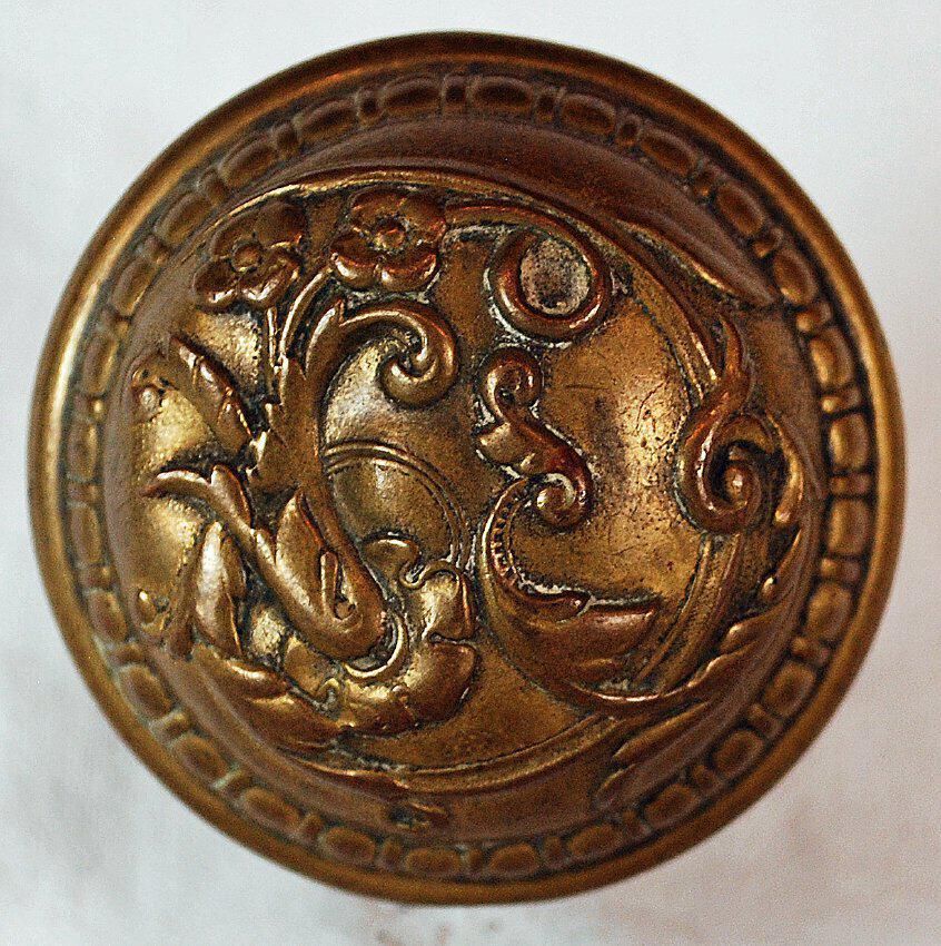 Design Name: De Barag Manufacture: Russel & Erwin Mfg. Co. Style: Material: Brass Manufacturing Method: Wrought / Stamped Surface Finish: Plated VDA Classification: Asymmetric VDA Number: B - 201 Shape: Domed Patent Specifics: Lock Type (If Applicable): Inscription/Makers Mark: Inscription Text: Comments: Face is Dented. Two piece, Brass and Cast Iron Shank.