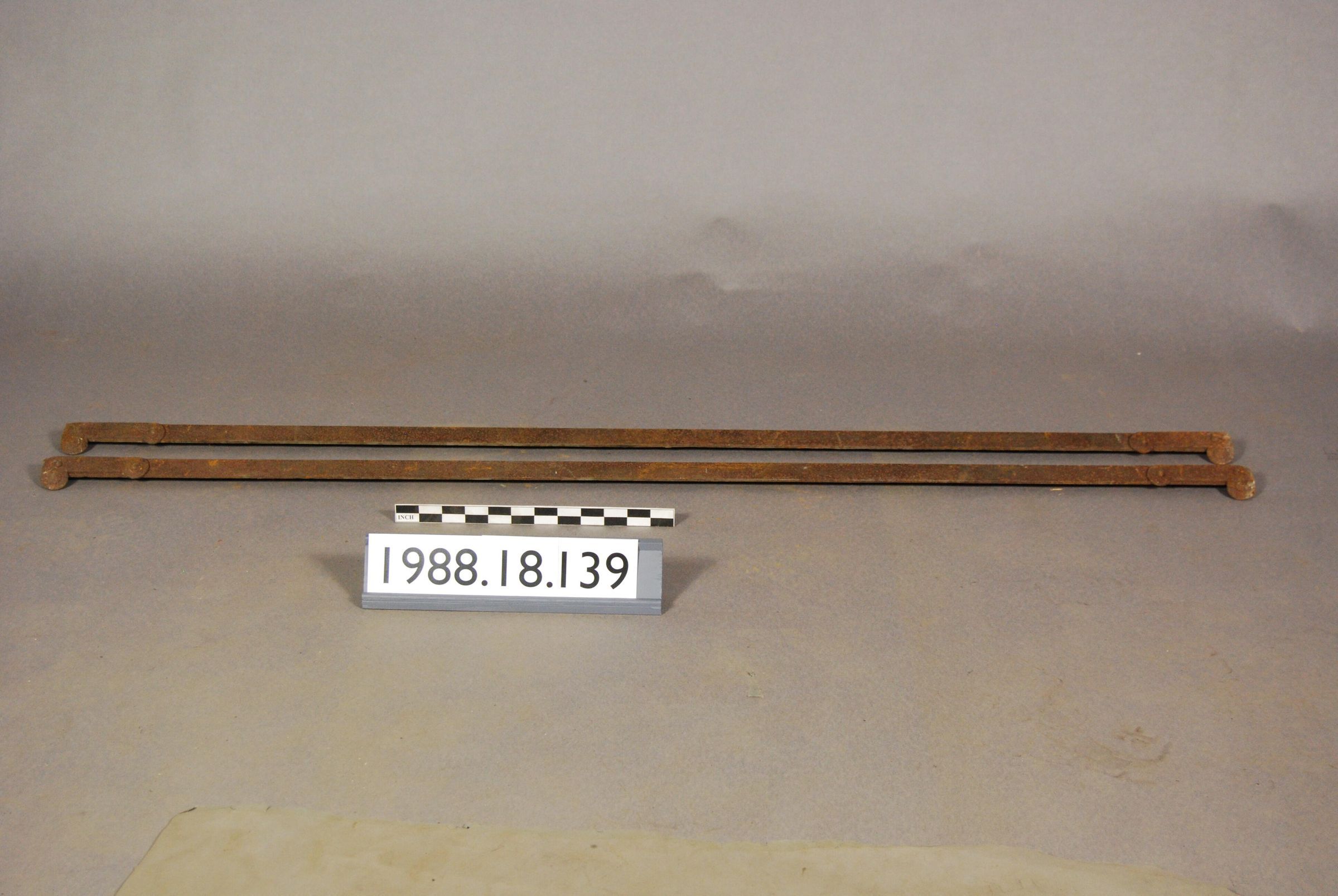 One lot of two angle iron / steel sections with ornaments riveted onto both ends of both sections. Function undetermined.