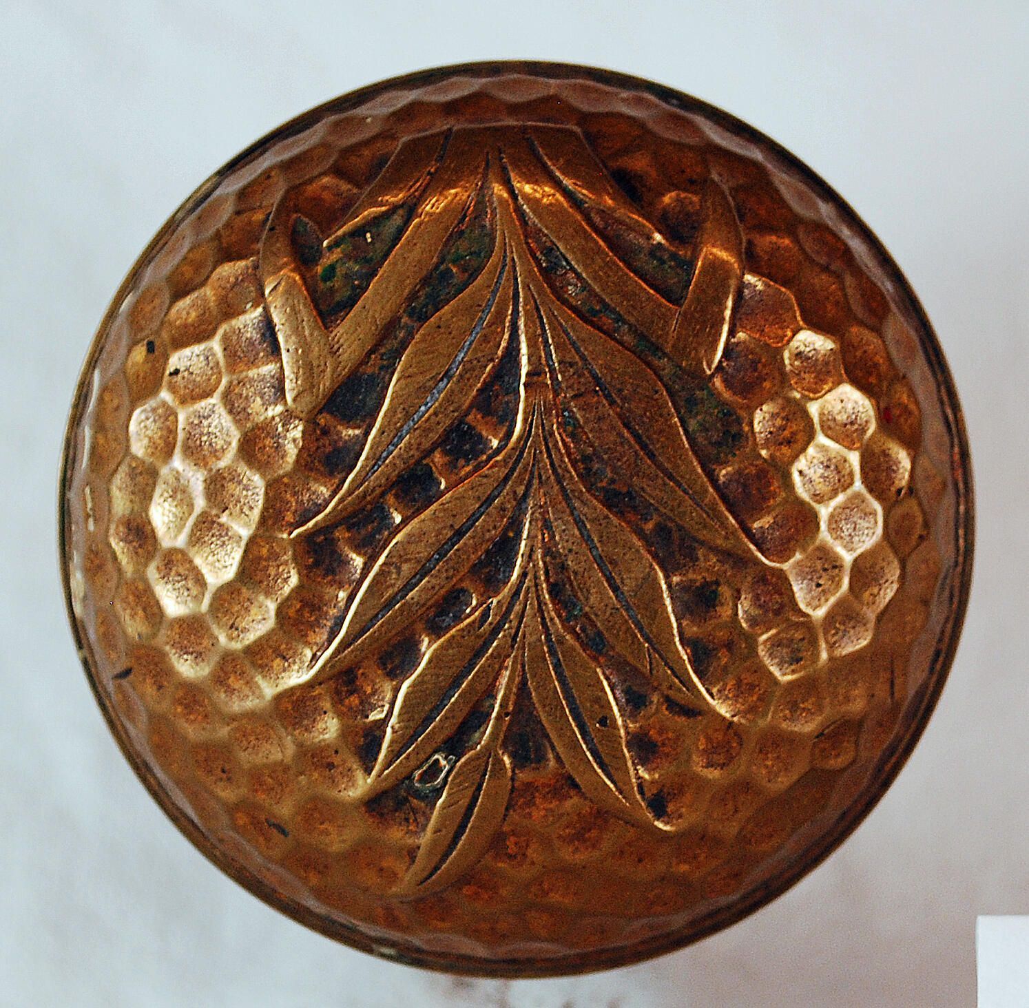 Design Name: Manufacture: Style: Aesthetic Material: Bronze Manufacturing Method: Cast Surface Finish: Unpolished (VDA-Doorknobs Only): VDA Classification: Asymmetric VDA Number: B - 209 Shape: Domed Patent Specifics: Lock Type (If Applicable): Inscription/Makers Mark: Inscription Text: Comments: Fine Detail on Leaves. Possible Hand.