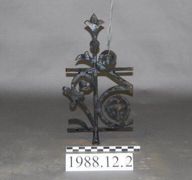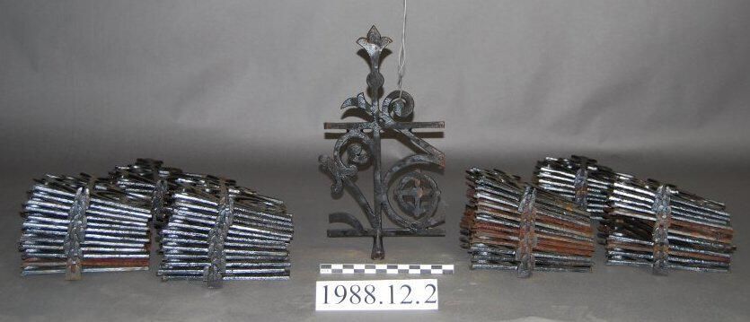 One lot of sixty-four reproduction cast iron roof cresting segments. Open scrolled filigree. Fleur-de-Lis Finial. Single mounting foot. Approximately 12 inch modular width for each section. Two sections are broken. Most sections painted black / green. Other sections rusty. Reproduced from 1988.12.1 Pattern.