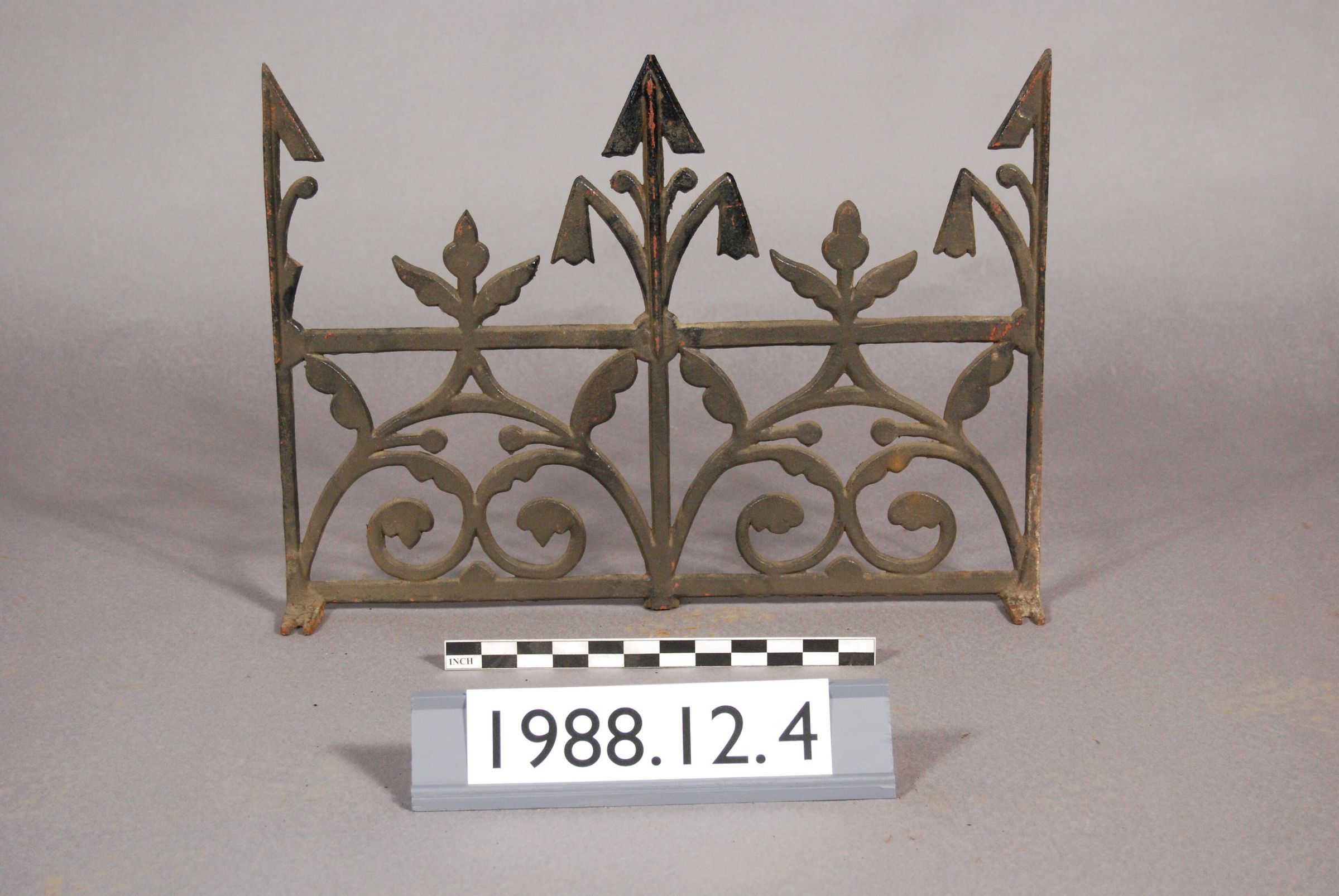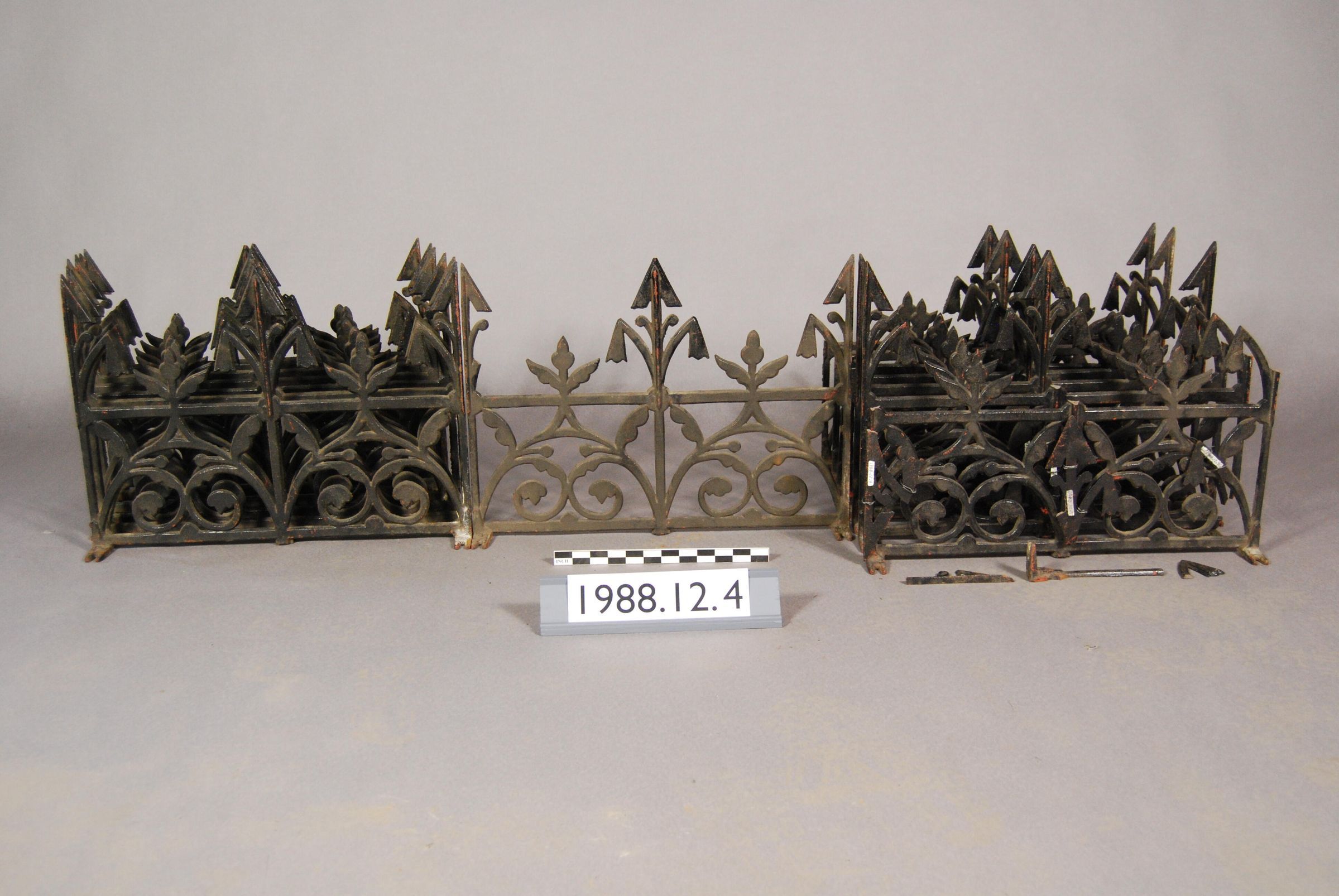 One lot of sixteen cast iron roof cresting segments. Open scrolled filigree with botanical motifs. Each section has series of finials and three mounting feet. Eight sections complete. Two sections complete but broken. Six sections incomplete and/or broken.