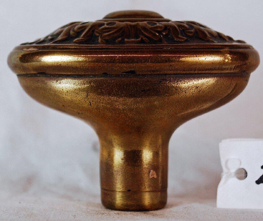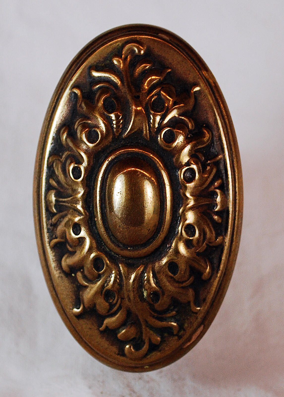 Design Name: Manufacture: Style: French Renaissance Material: Brass Manufacturing Method: Wrought / Stamped Surface Finish: Aged / Unpolished VDA Classification: VDA Number: N - 139 Shape: Oval / Egg Patent Specifics: Lock Type (If Applicable): Inscription/Makers Mark: Inscription Text: Comments: One of a Pair - #2013.22.47