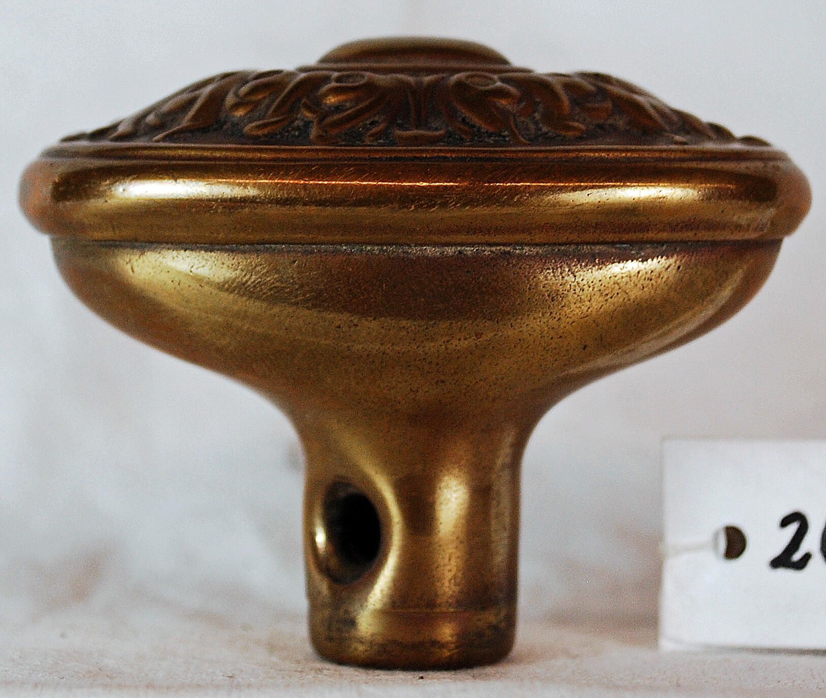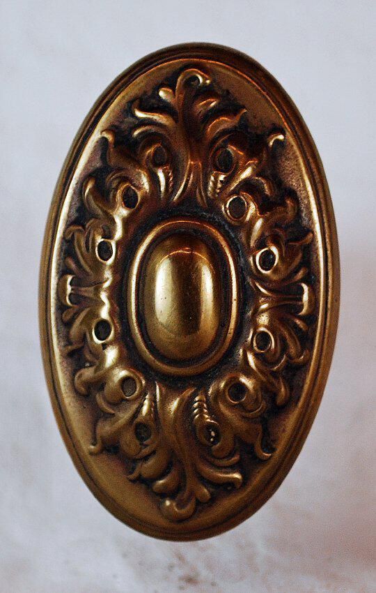 Design Name: Manufacture: Style: French Renaissance Material: Brass Manufacturing Method: Wrought / Stamped Surface Finish: Aged / Unpolished VDA Classification: VDA Number: N - 139 Shape: Oval / Egg Patent Specifics: Lock Type (If Applicable): Inscription/Makers Mark: Inscription Text: Comments: One of a Pair - #2013.22.46