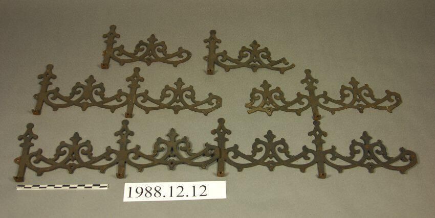 One lot of six cast iron roof cresting segments. Open filigree scrolled botanical motifs. Four segments are double width. One is truncated at end. Each of the segments has two Finials. Each of the segments has embossed numeral "4" on front of one of the two Finials. The other two segments are single width with single Finial. 15" modular width. One of these sections is truncated at end. All painted black.