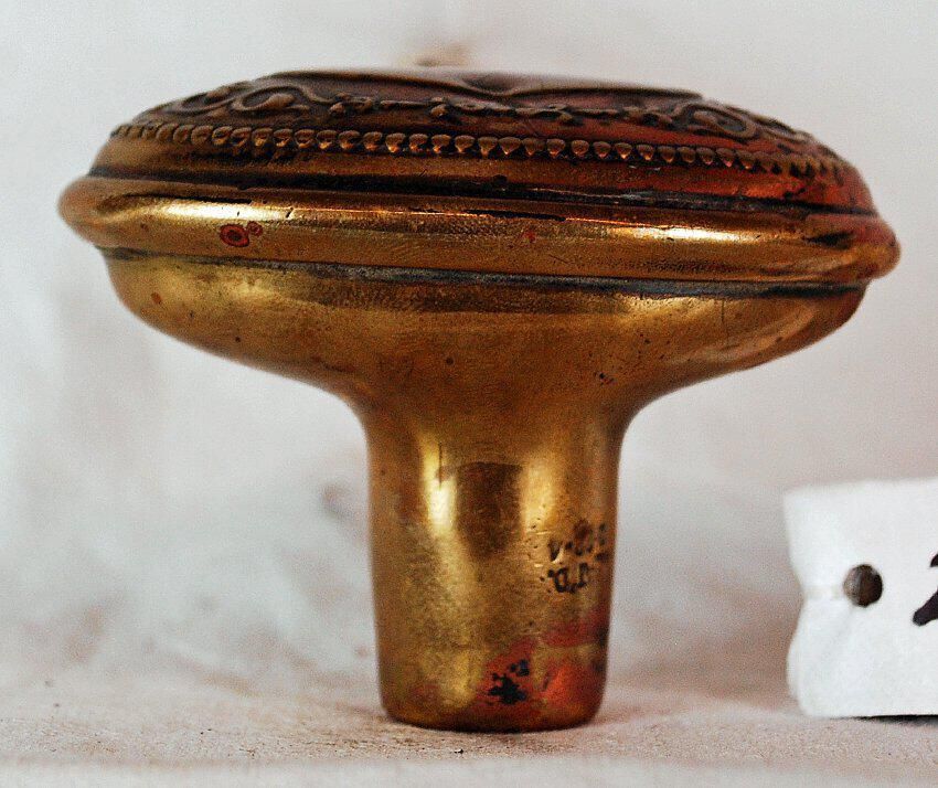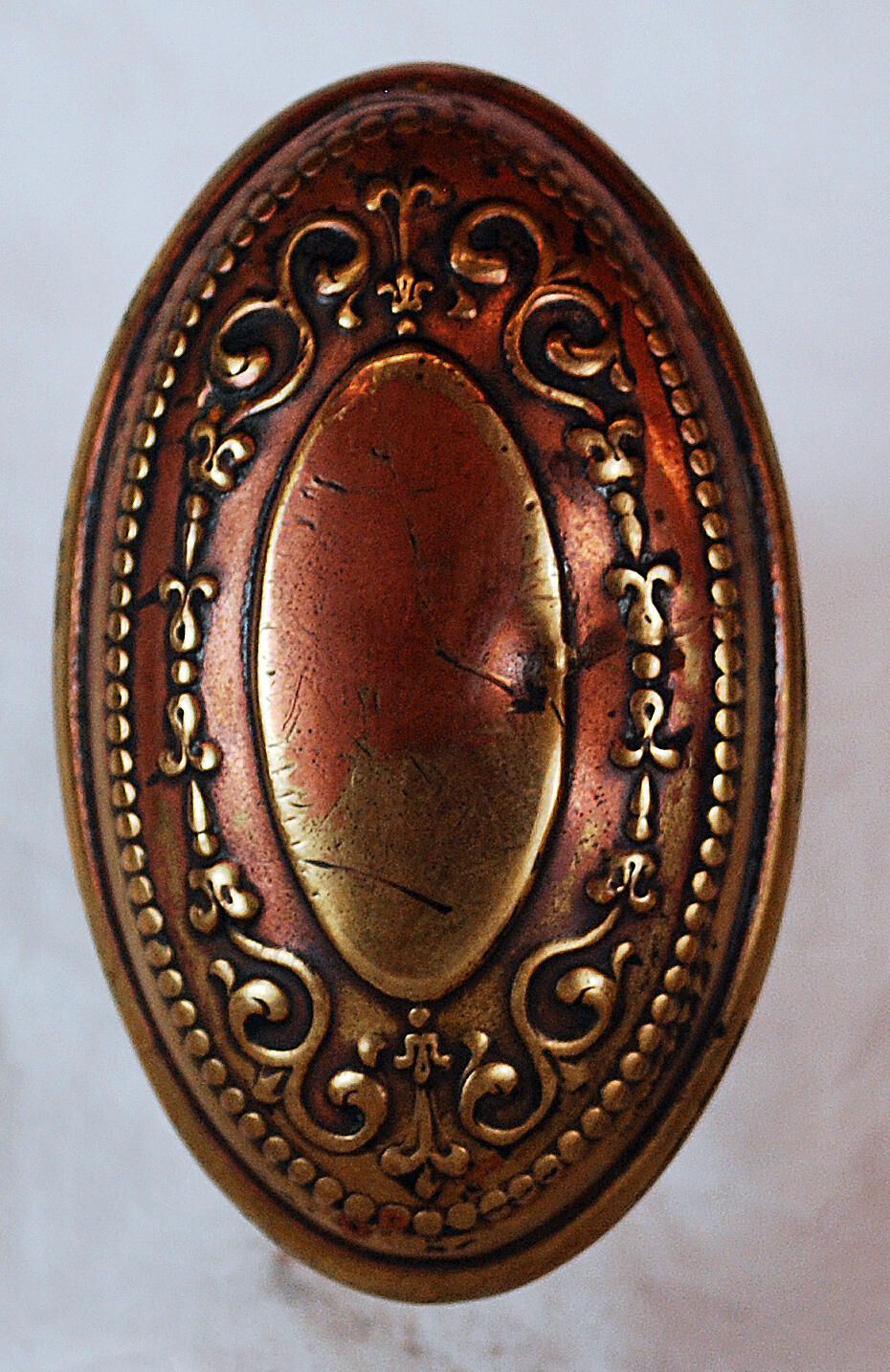 Design Name: Manufacture: Russell & Erwin Mfg. Co. Style: Material: Brass Manufacturing Method: Wrought / Stamped Surface Finish: Plated / Copper VDA Classification: Oval Knobs VDA Number: N - 114 Shape: Oval / Egg Patent Specifics: Lock Type (If Applicable): Inscription/Makers Mark: Inscription Text: ID 2-22 4 Comments: Worn and Dented on Center Front. Two Piece Copper Plated Brass With IronInsert in Shank