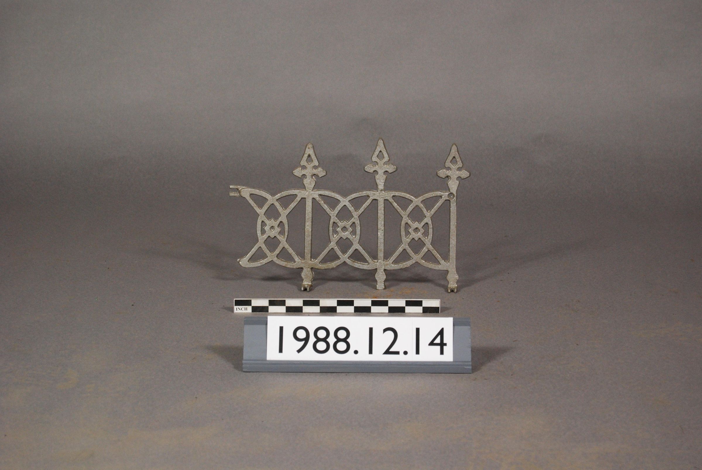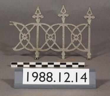 Single reproduction cast aluminum roof cresting segment. Open filigree geometric motif with three finials and three feet for mounting. Copied from 1988.12.13.