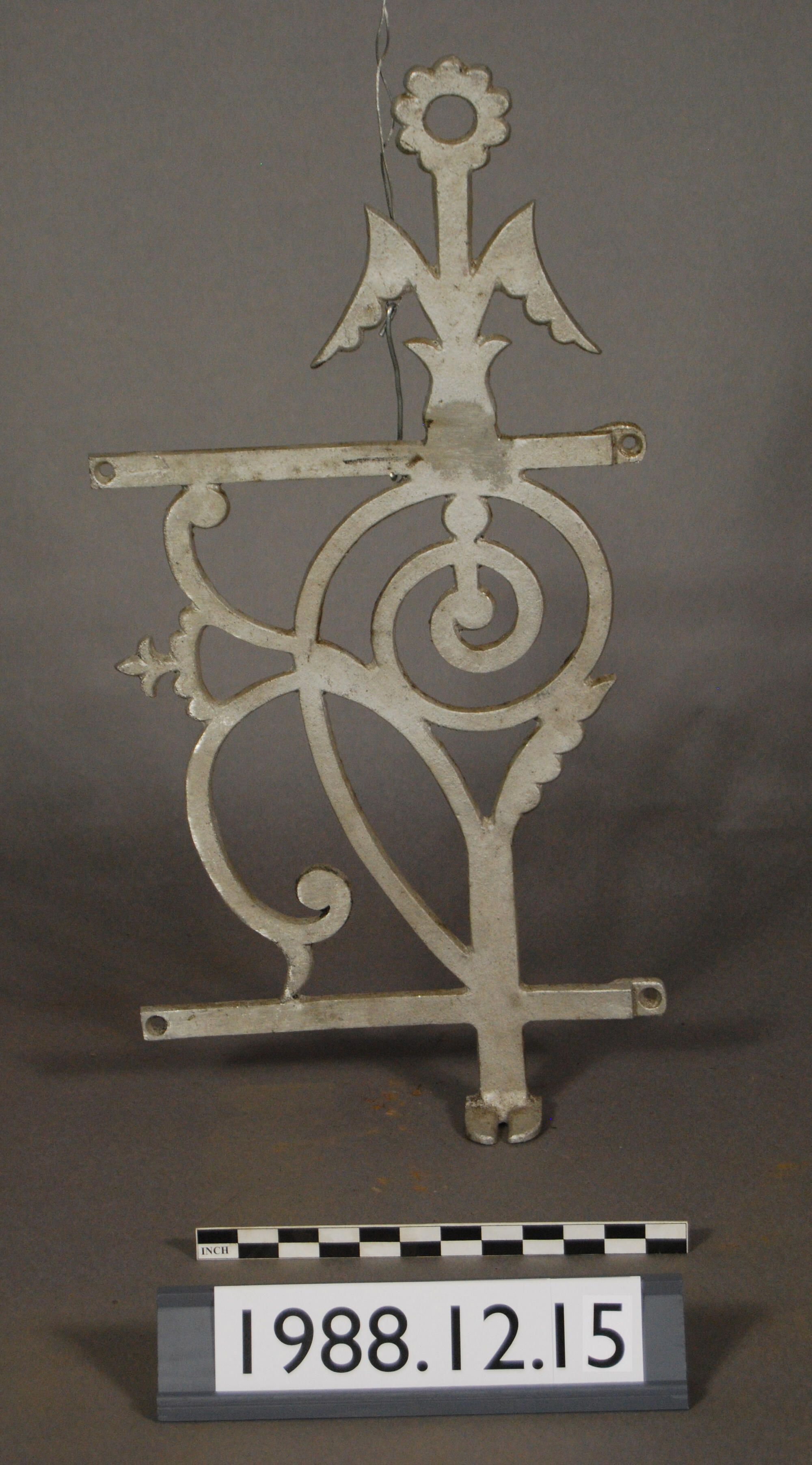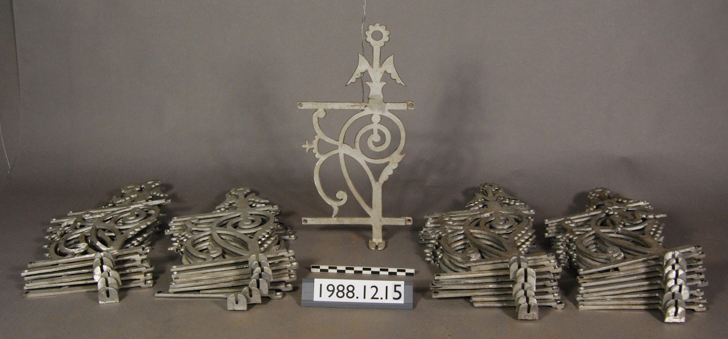 One lot of thirty-one reproduction cast aluminum roof cresting segments. Open filigree scrolled botanical Motifs. Winged finial with floral motif. Single foot for each segment. Six segments are broken.