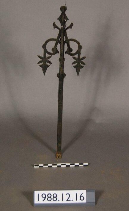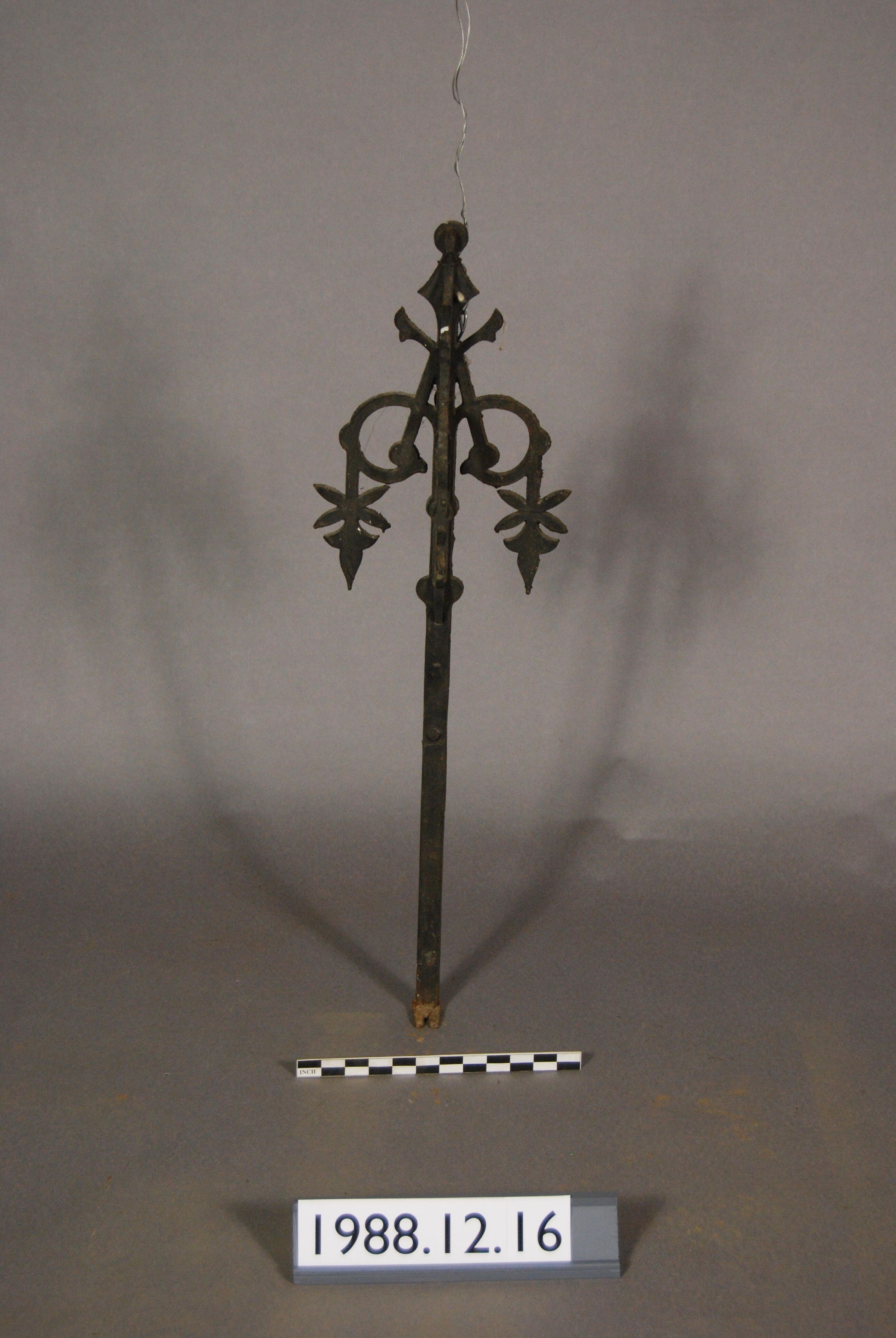Single cast iron roof cresting post with four open scrolled botanical motif branches for finial. Embossed numeral "5" on post. Lower end has mounting foot. Painted black. Design matches 1988.12.17.