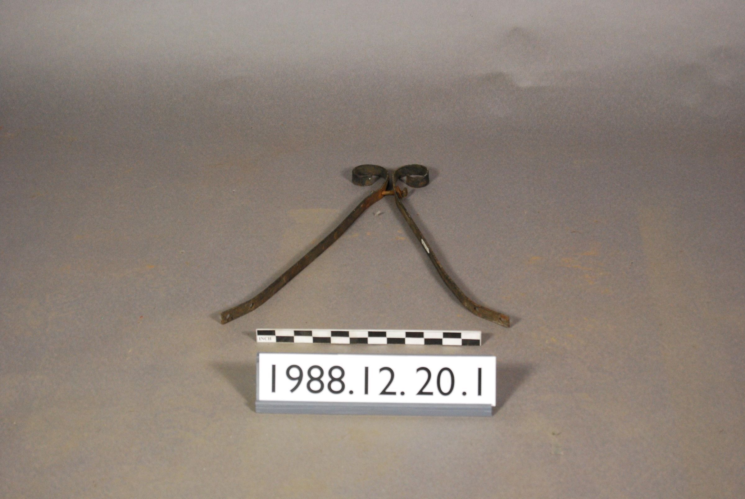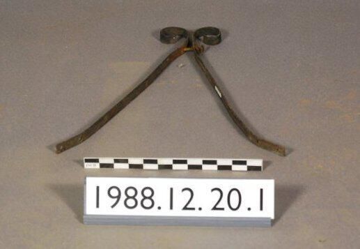 Two iron straps joined by bolt. Each strap scrolled at one end. Other end has mounting holes. Painted black. (Related to 1988.20). Brace for cresting corner post.