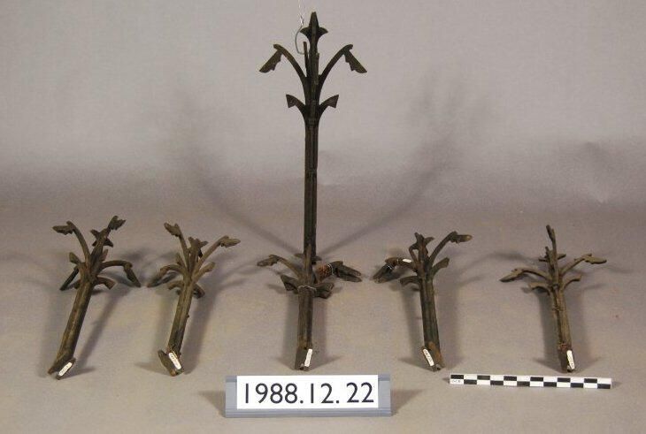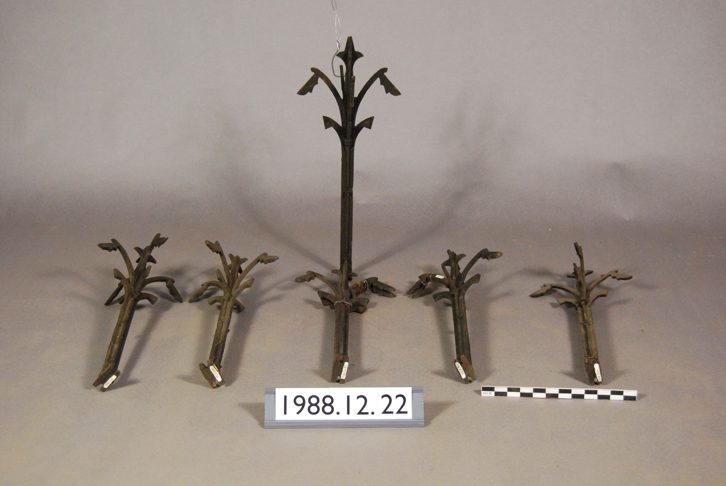 One lot of six cast iron roof cresting posts with four wnged botanical motif branches for each respective Finial. Two cresting posts are complete. Four have incomplete or broken finials. Each has single mounting foot. Painted black.