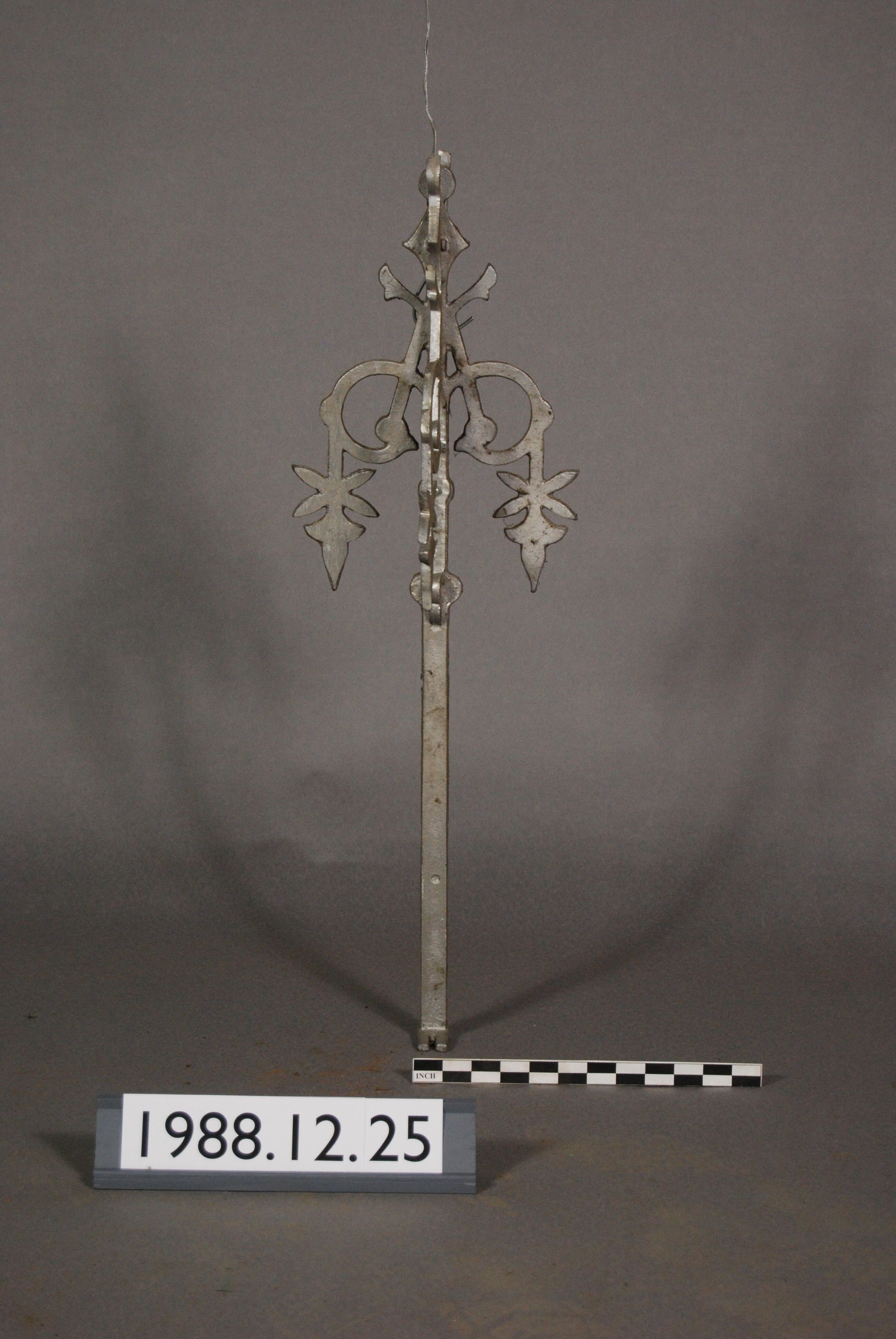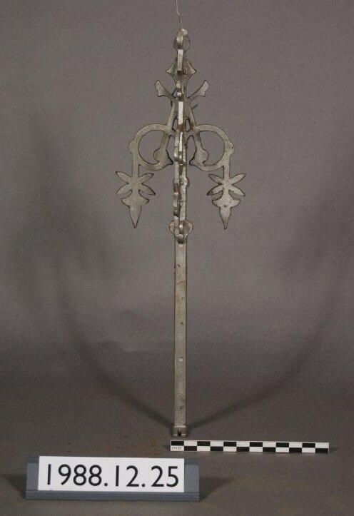 Single reproduction aluminum roof cresting post with open scrolled botanical motif branches for finials. Single Mounting Foot.