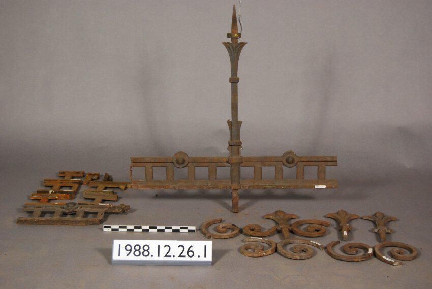 One lot of fifteen cast iron fragments. Scroll, fleur-de-Lis, various fragments from fence 1988.12.26 Inscriptions or Markings: Manufacturer: Place of Manufacture: Design motif: Botanical. Style: Finish: Painted.