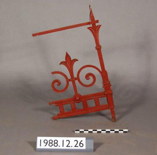 Cast iron fence section. Imitation of forged wrought iron. Lower section has open squares, mid-section Scrolls and Fleur-de-Lis. One vertical post with finial and horizontal rail. Painted red.
