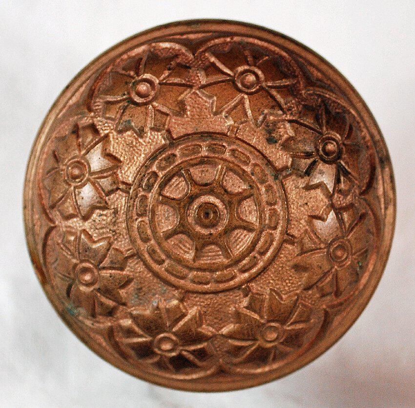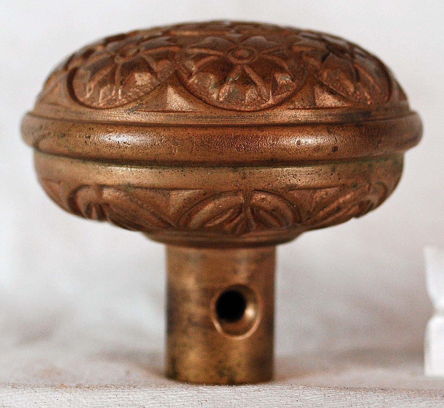 Design Name: Manufacture: Hopkins & Dickerman Mfg. Co. Style: Aesthetic Material: Bronze Manufacturing Method: Cast Surface Finish: Aged / Unpolished VDA Classification: VDA Number: K - 213 Shape: Domed Patent Specifics: Lock Type (If Applicable): Inscription/Makers Mark: Inscription Text: Comments: .Appears to Have Been Chemically Stripped?