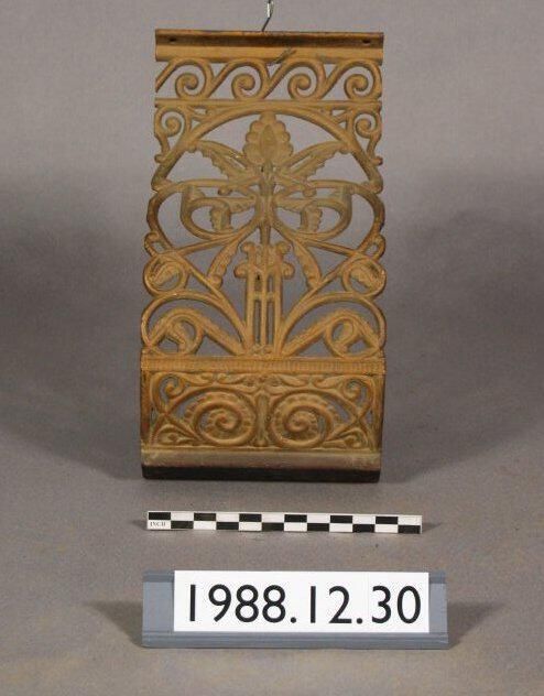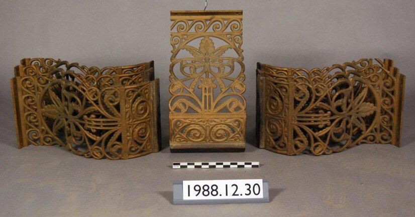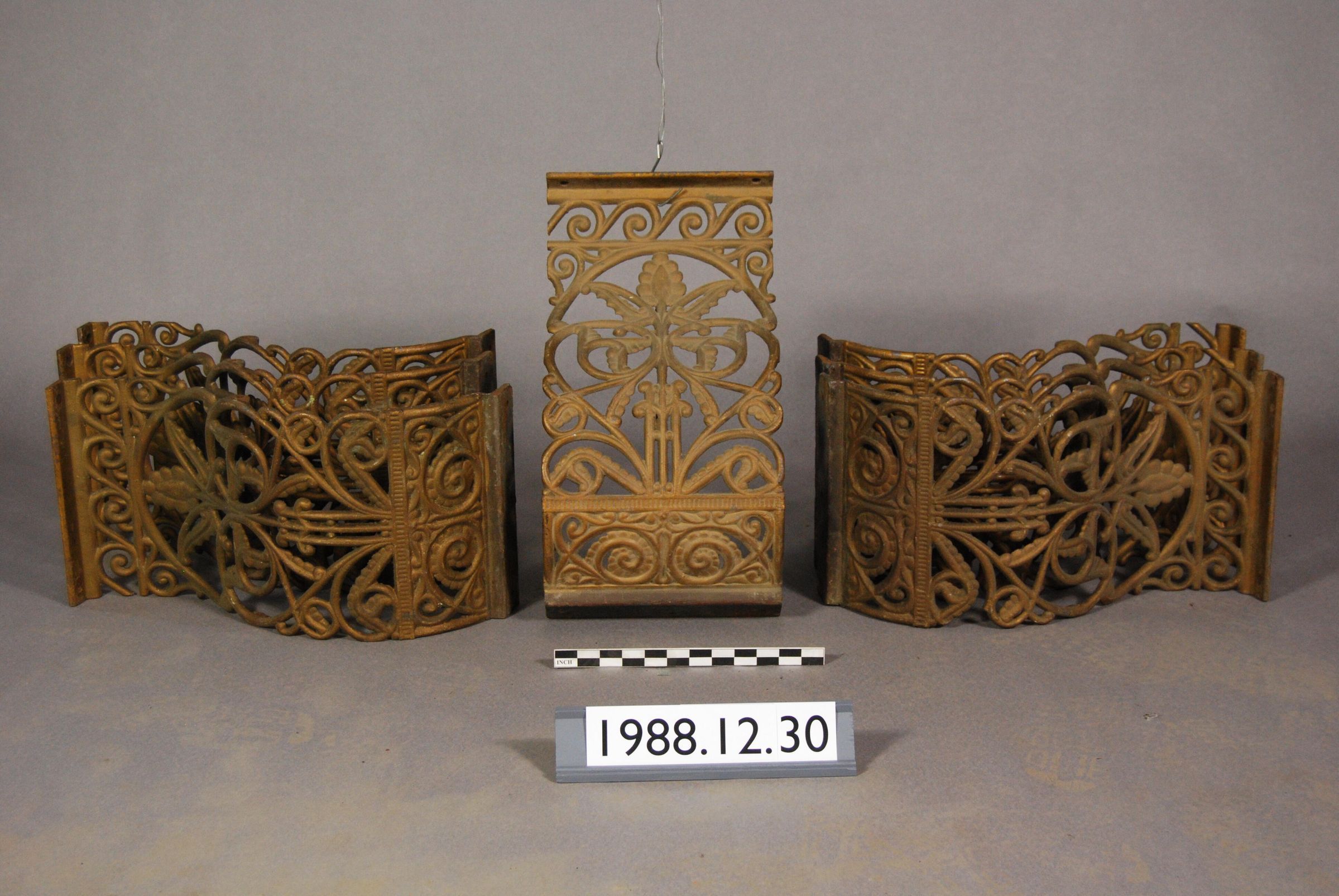One lot of six cast iron Balusters. Curved frame with open Filigree Scrolled Botanical Motifs. Mounting Flange on top and bottom edges. Painted with brass colored paint.